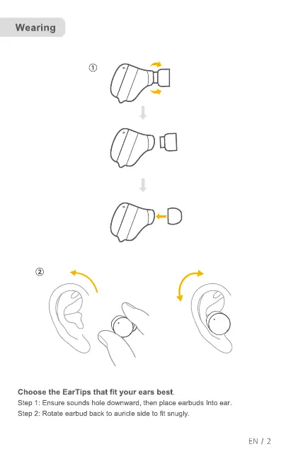 Step 1: Ensure sounds hole downward. then place earbuds Into ear.
