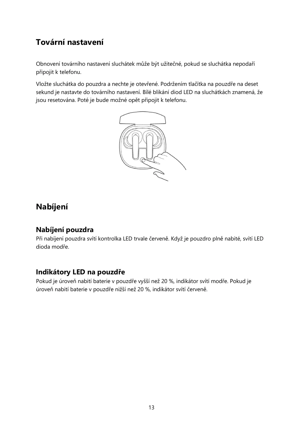 Vložte sluchátka do pouzdra a nechte je otevřené. Podržením tlačítka na pouzdře na deset