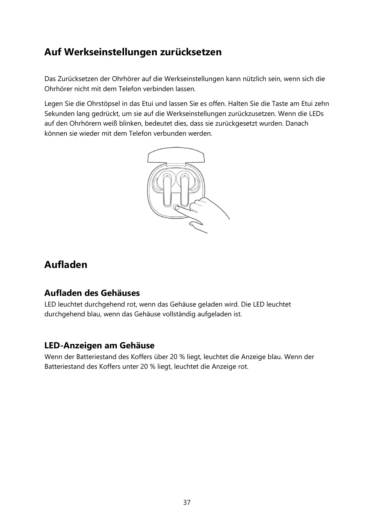 Legen Sie die Ohrstöpsel in das Etui und lassen Sie es offen. Halten Sie die Taste am Etui zehn