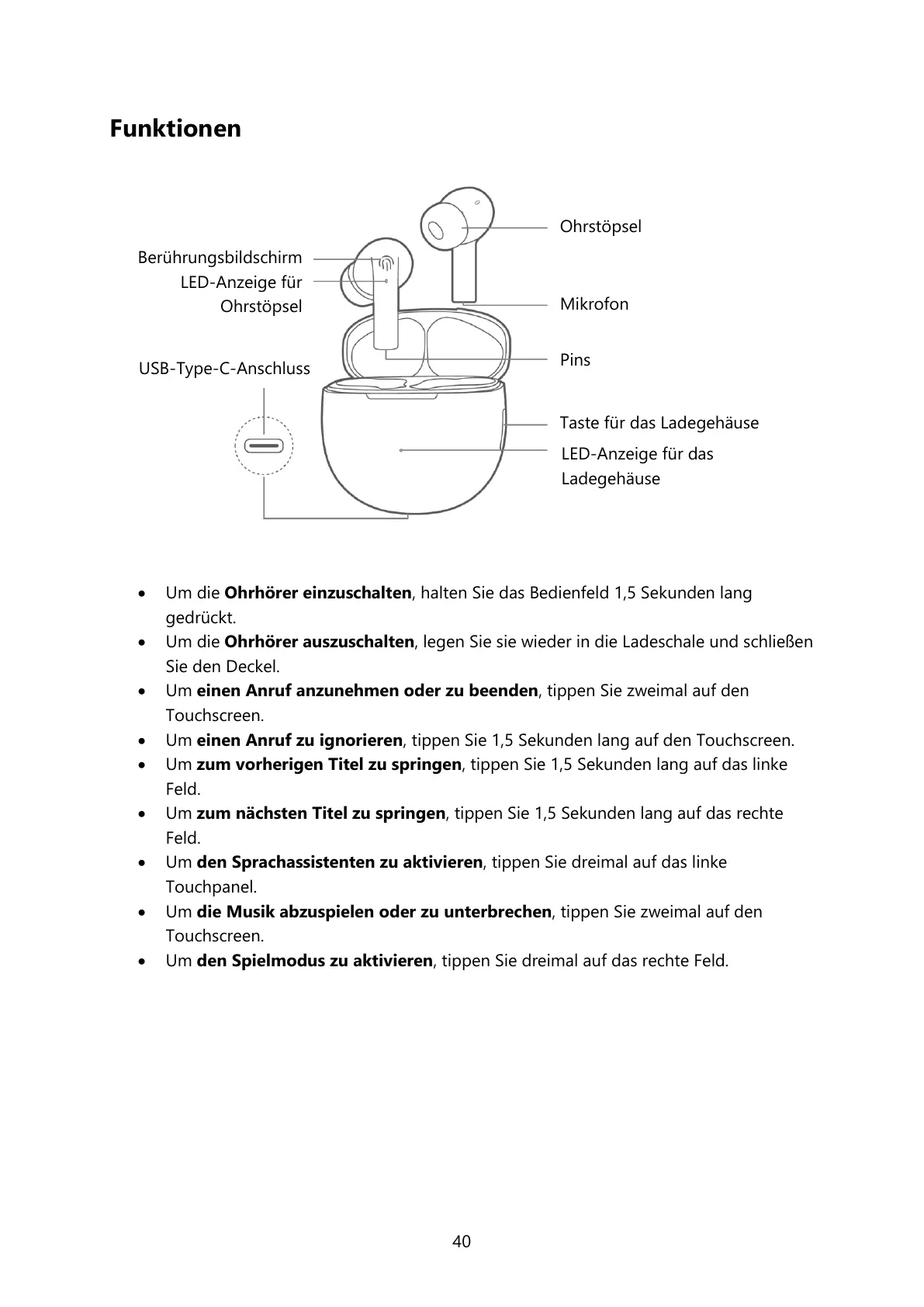 Um die Ohrhörer einzuschalten, halten Sie das Bedienfeld 1,5 Sekunden lang