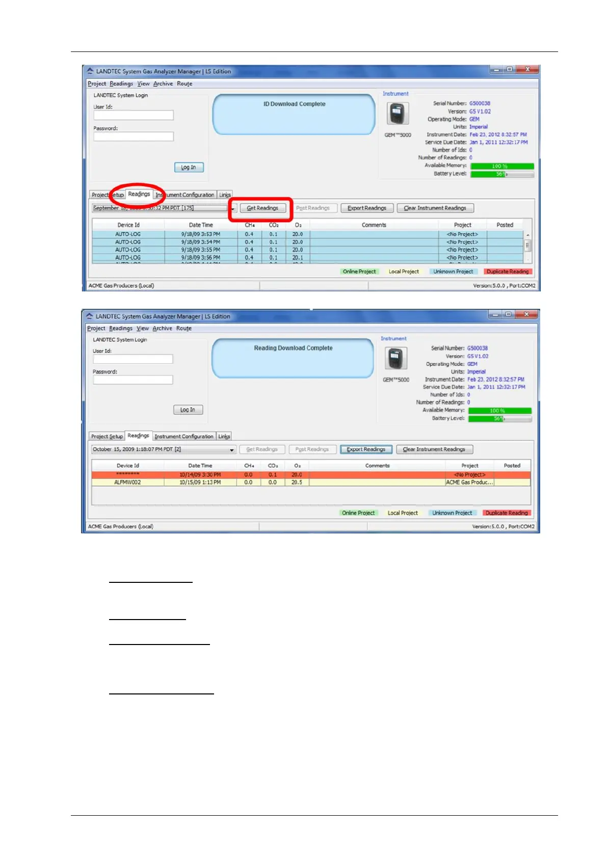When the instrument is initially detected by the LSGAM software, the Get Readings button