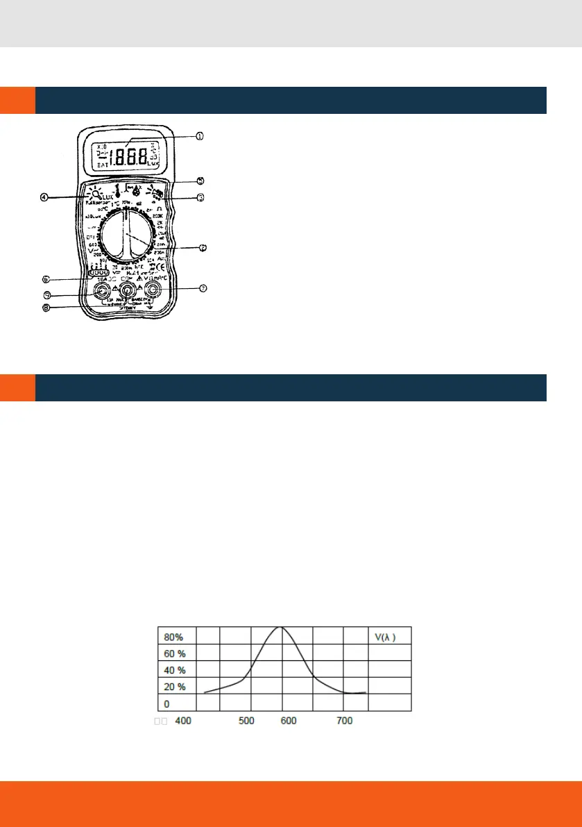 1. LCD display: 3 1/2 digits LCD display with units of Lux,