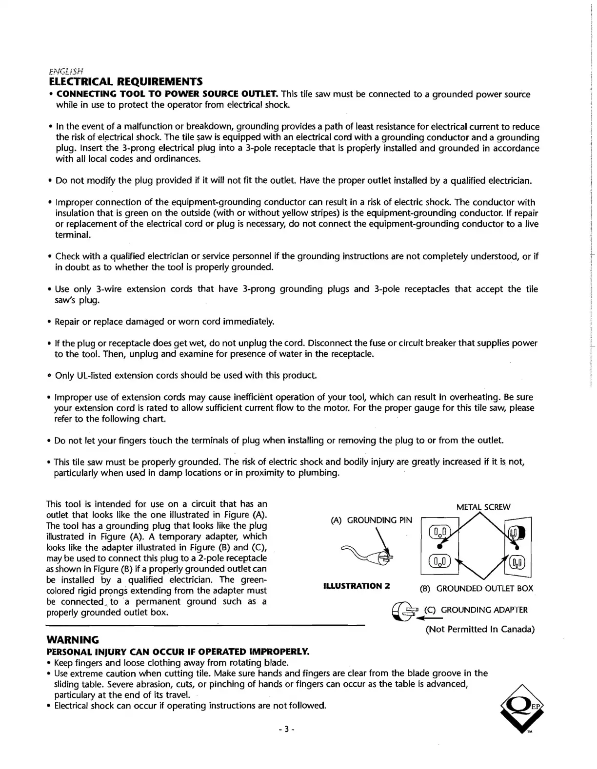 QEP 60020 - Electrical Requirements and Grounding; Power Connection and Grounding; Extension Cord and Adapter Usage