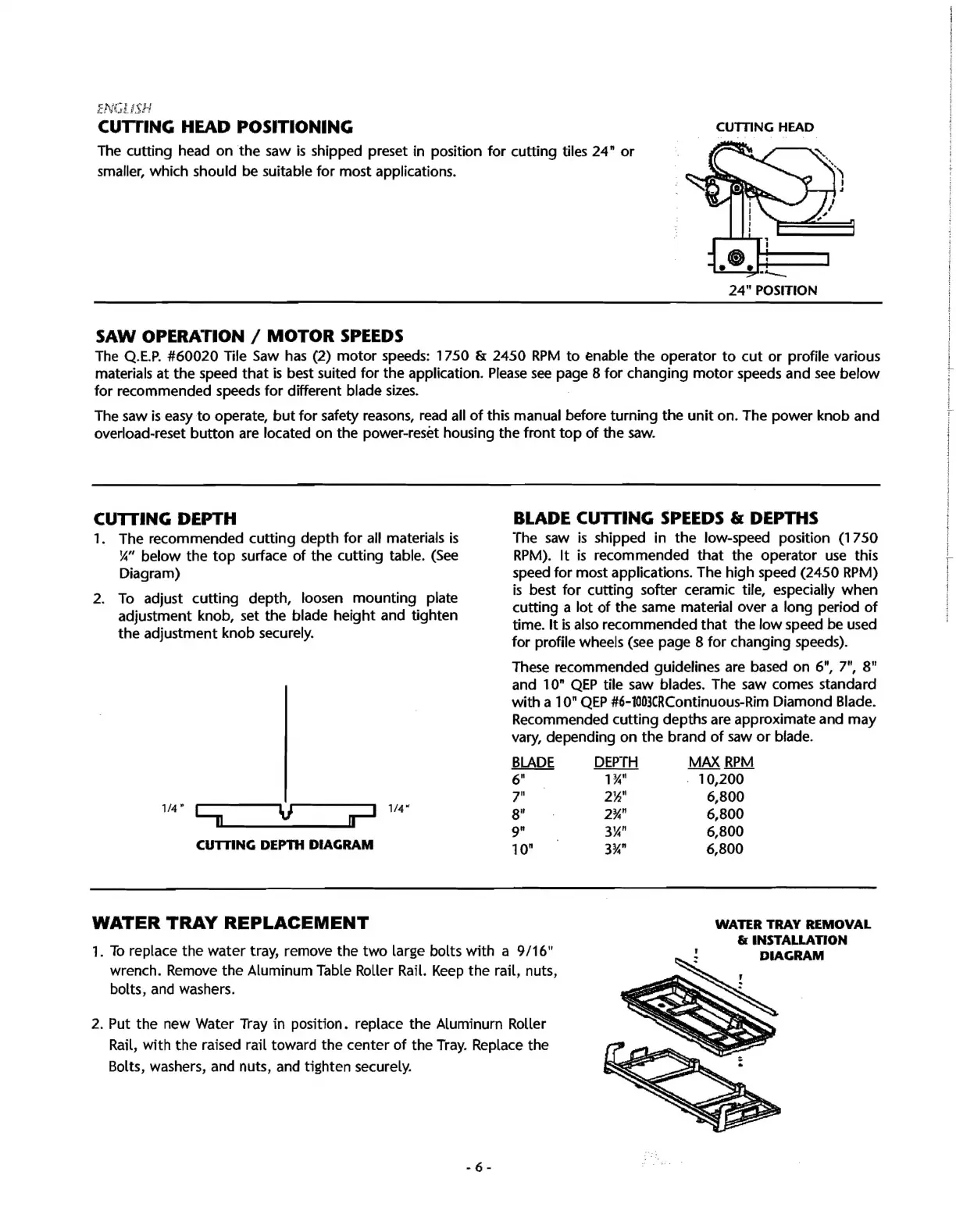 QEP 60020 - Saw Operation; Blade Cutting Speeds & Depths; Water Tray Installation