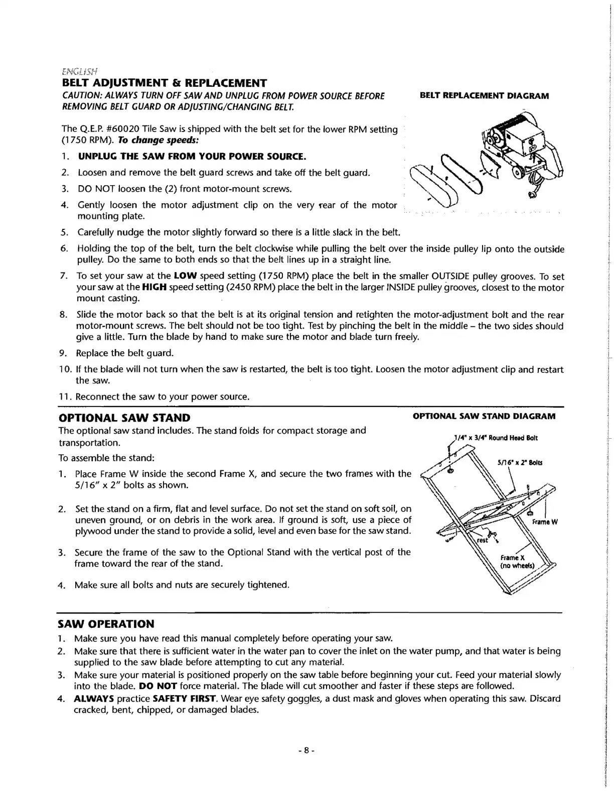 QEP 60020 - Belt Adjustment & Replacement; Optional Saw Stand; Saw: Opelallün.a