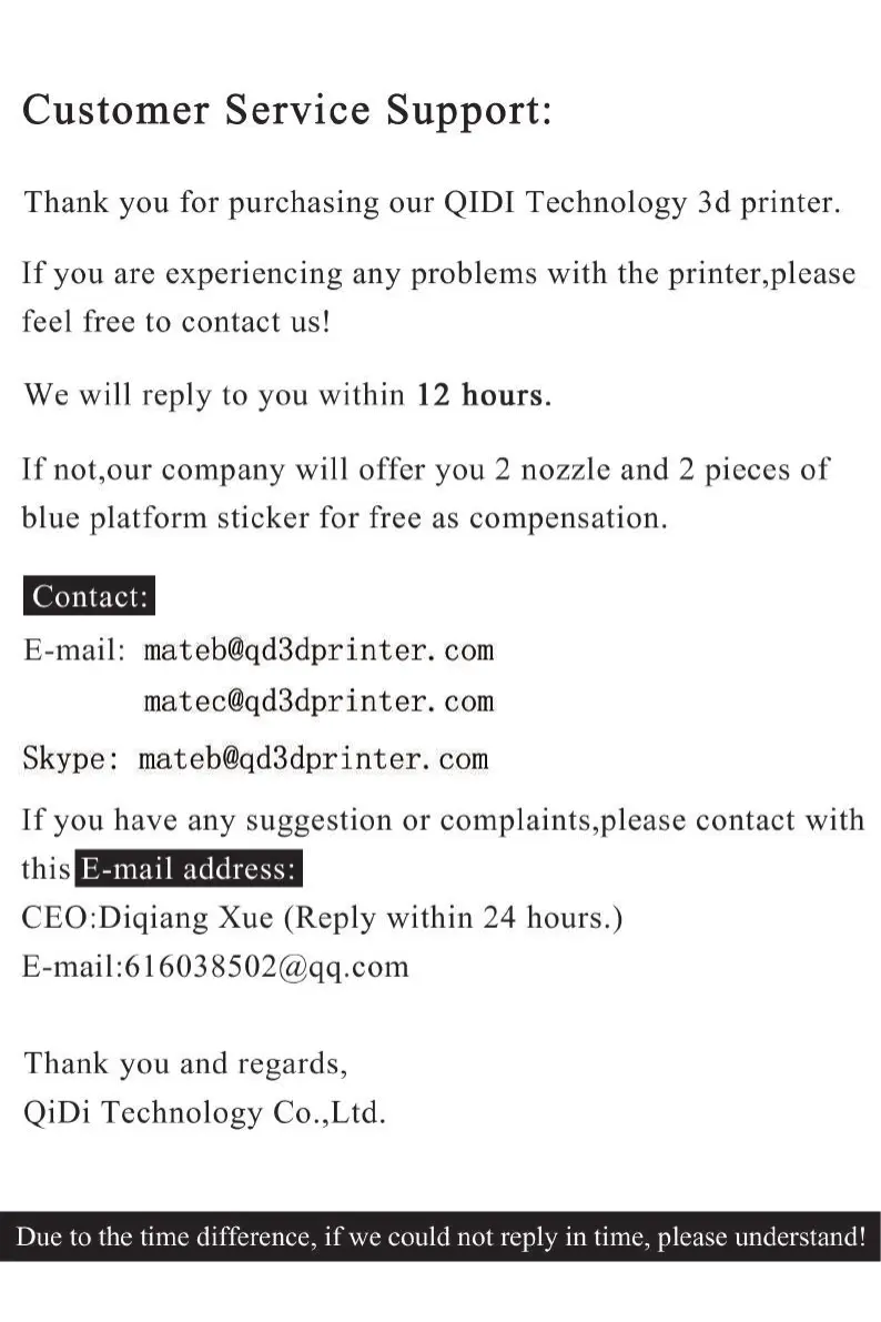 QIDI i-mate s - Customer Service Support; Contact Details and Support Channels