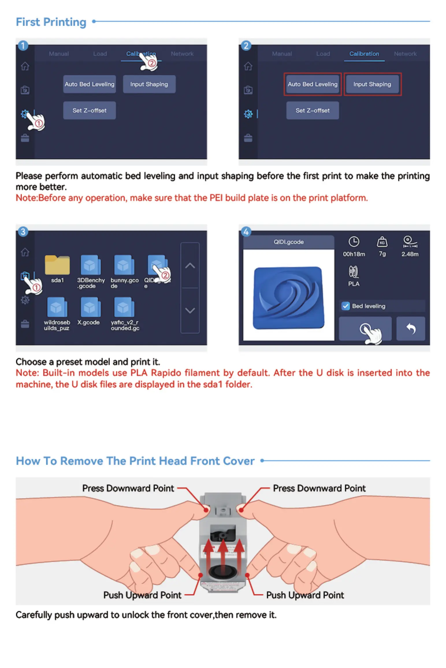 Note: Built-in models use PLA Rapido filament by default. After the U disk is inserted into the