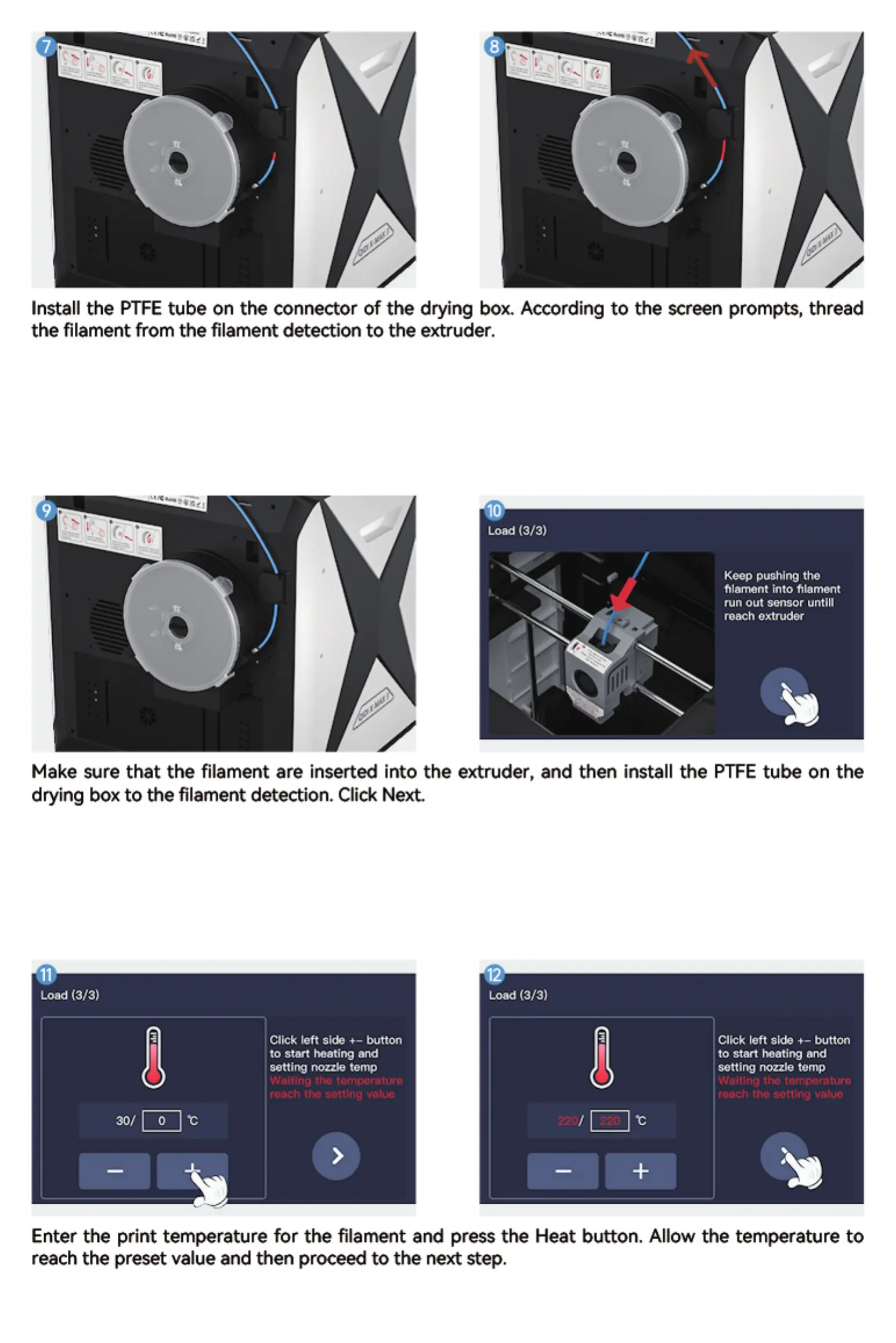 Install the PTFE tube on the connector of the drying box. According to the screen prompts, thread