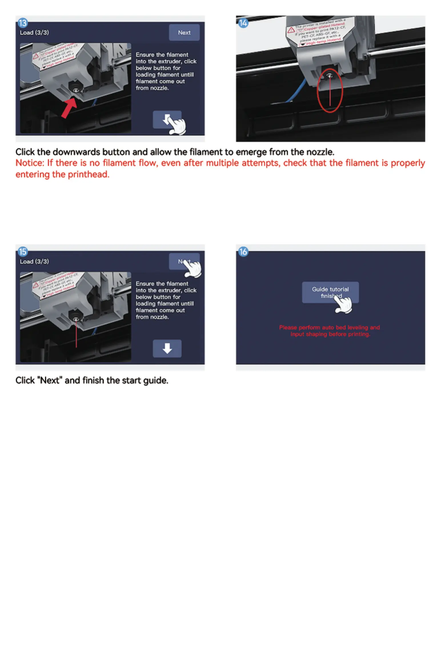 Notice: If there is no filament flowt even after multiple attemptst check that the filament is properly