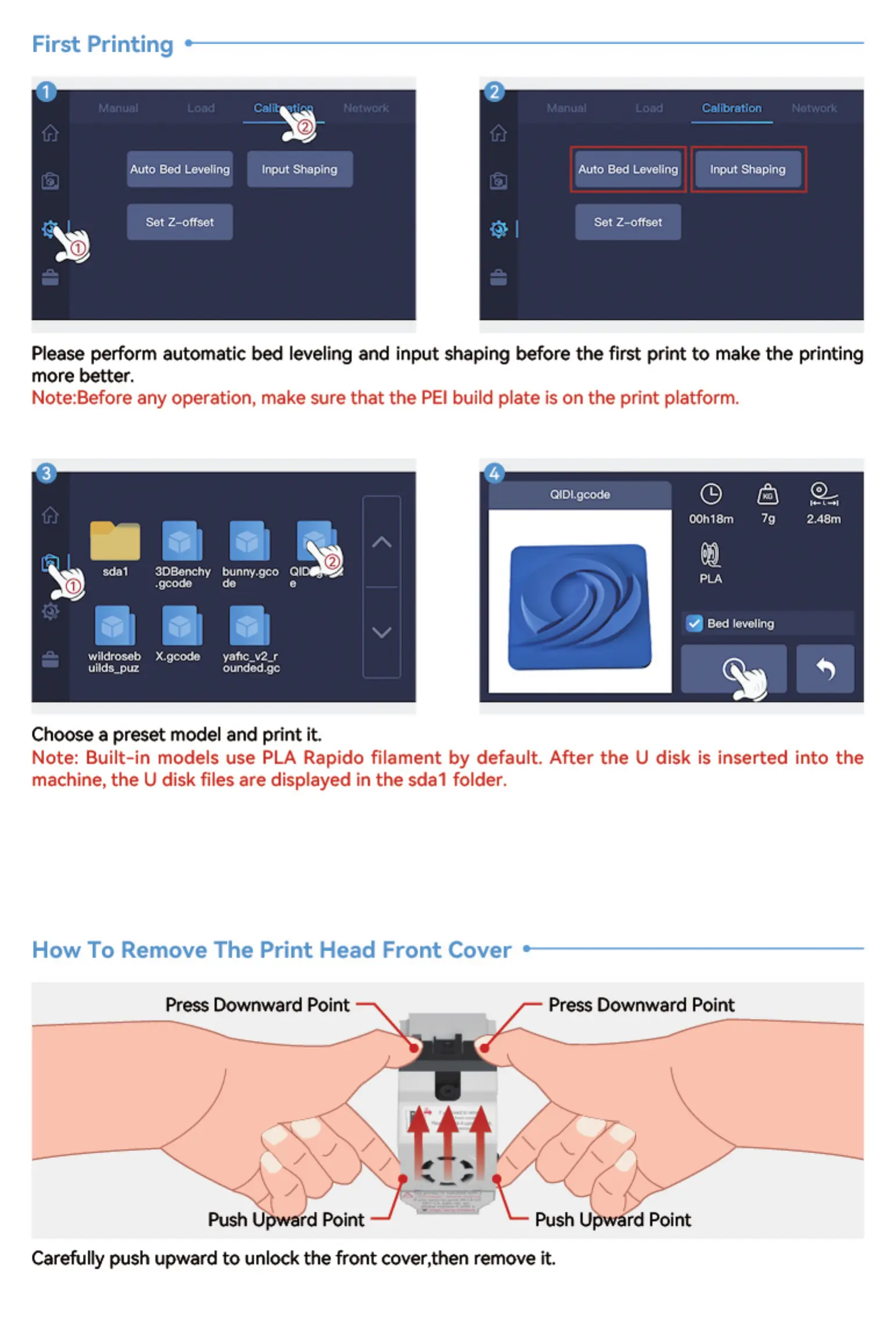 Note: Built-in models use PLA Rapido filament by default. After the U disk is inserted into the