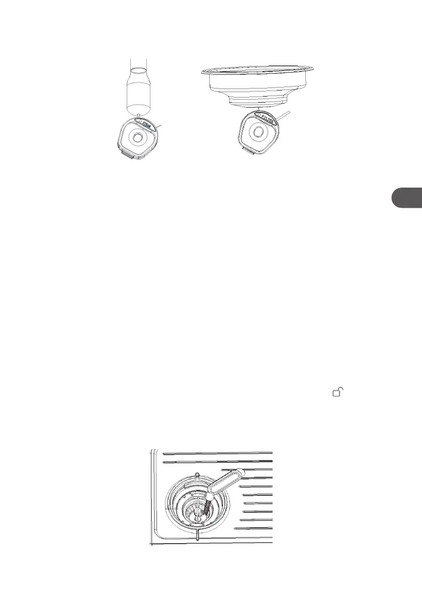 8. A gőzkar (10) és a szűrők (8) tisztításához használja a tisztítócsapot (16). A vastagabb csap