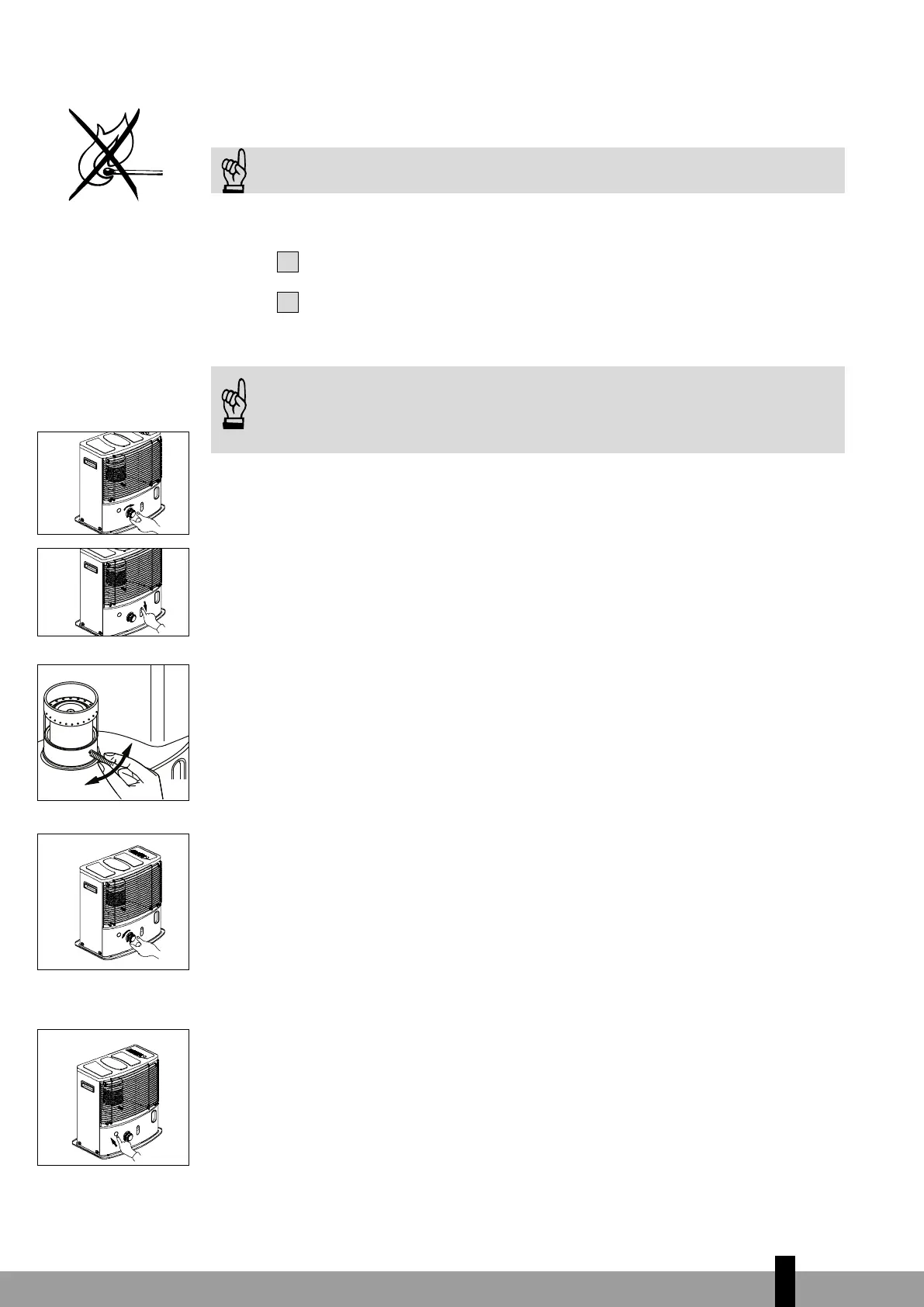 Always ignite the heater with the ignition mechanism. Never use matches or a