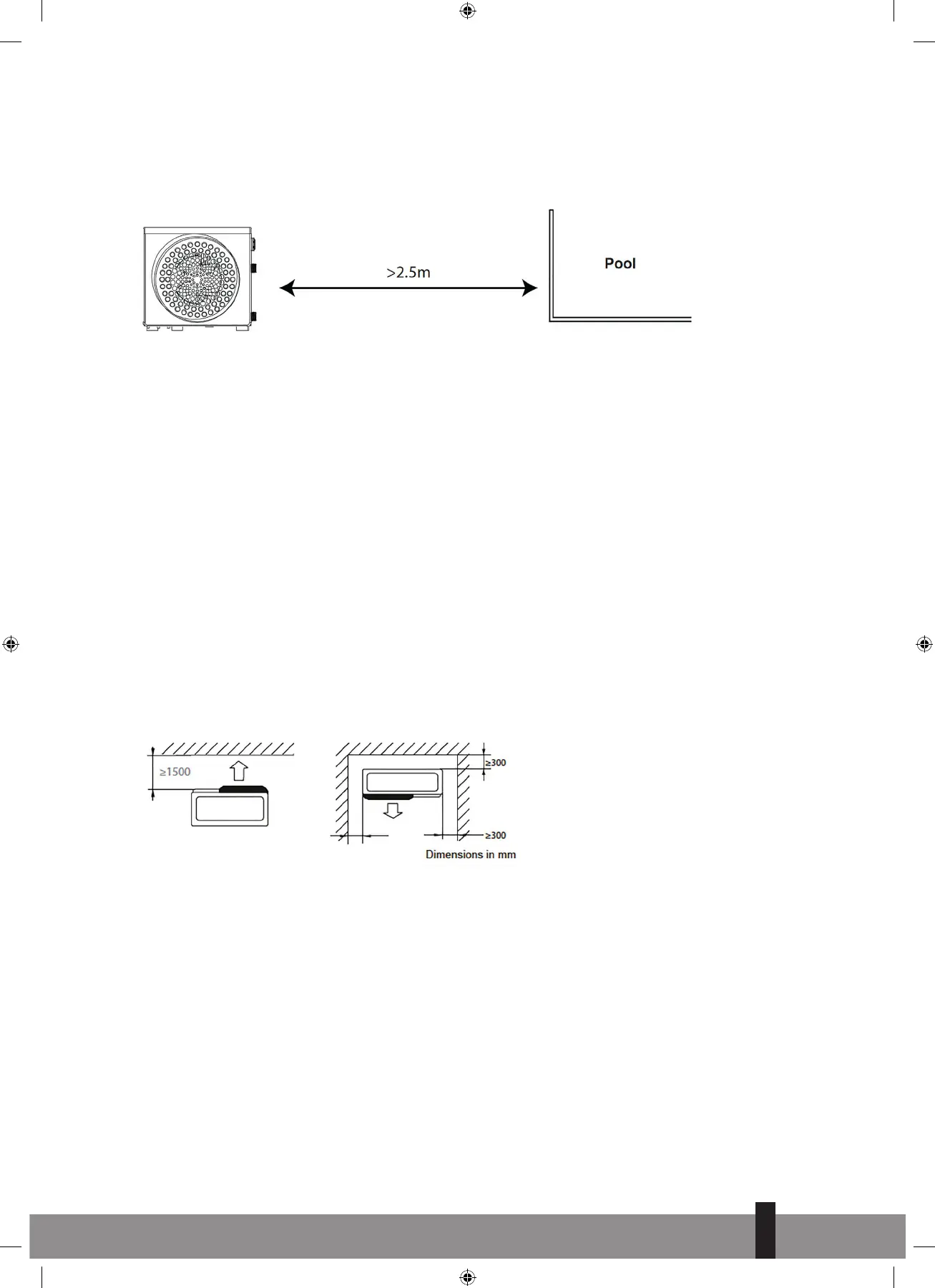 De warmtepomp moet op een afstand van minimaal 2,5 van het zwembad worden geplaatst.