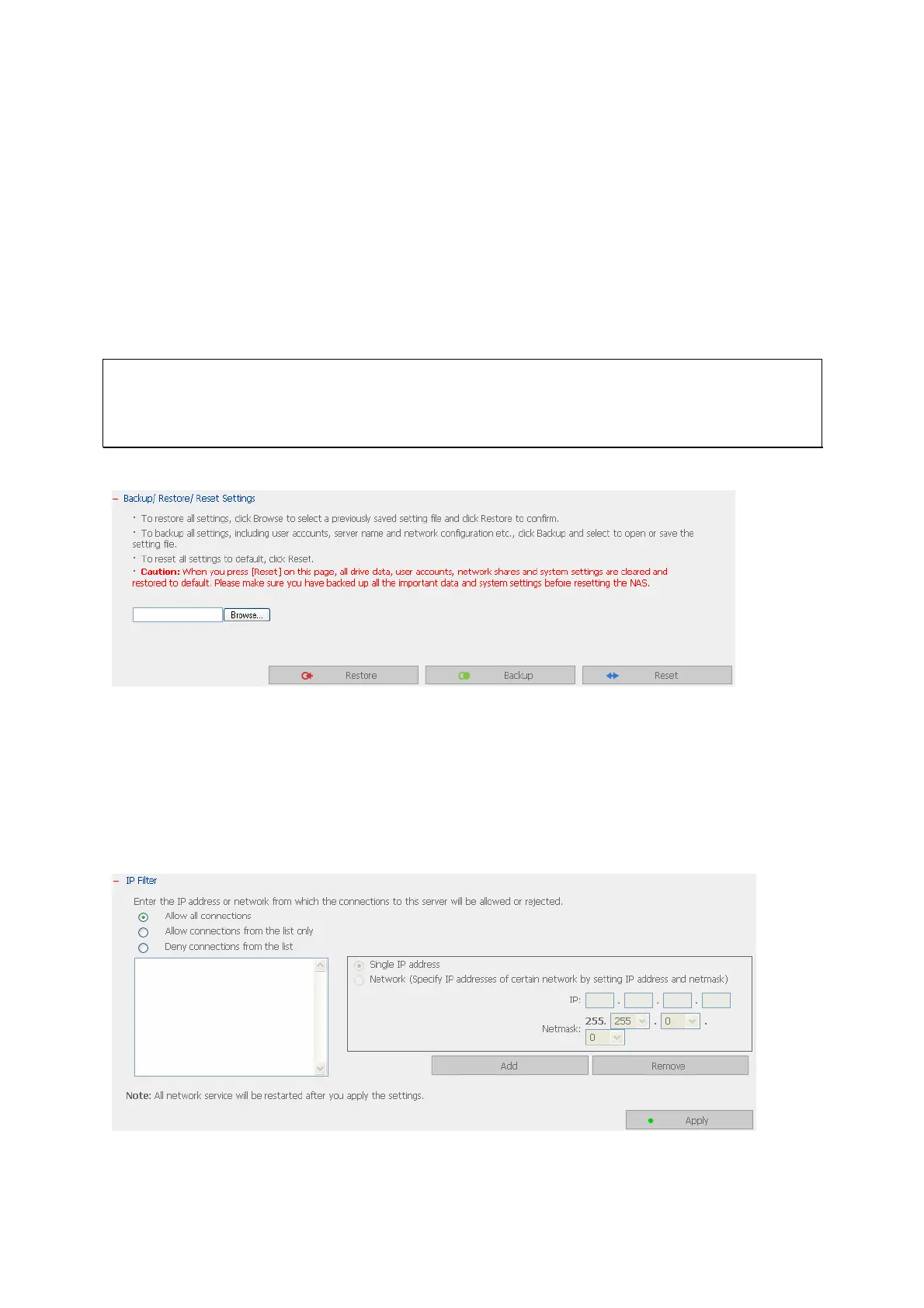 • To restore all settings, click Browse to select a previously saved setting file and click