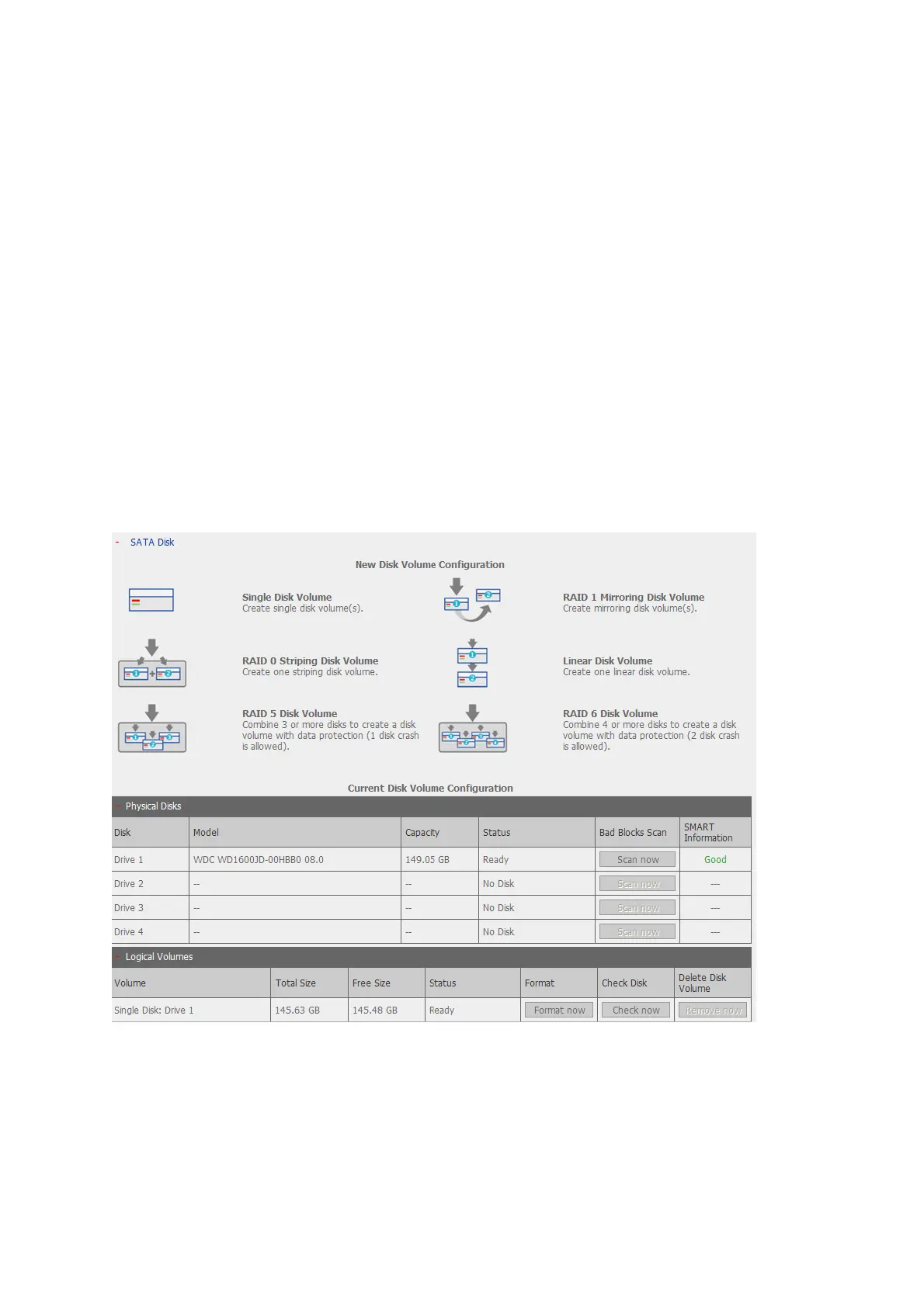 You can create the following disk volumes by clicking on the corresponding icon on the