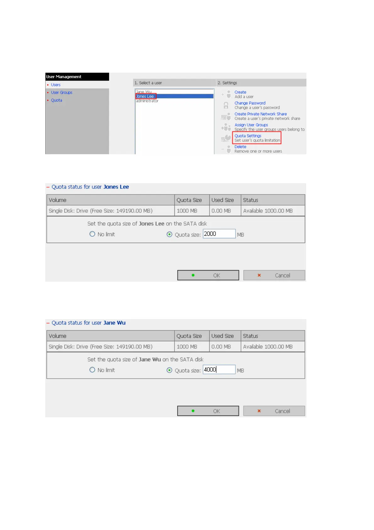 4. Follow the same steps and enter the quota size 4000MB for Jane Wu and click OK.