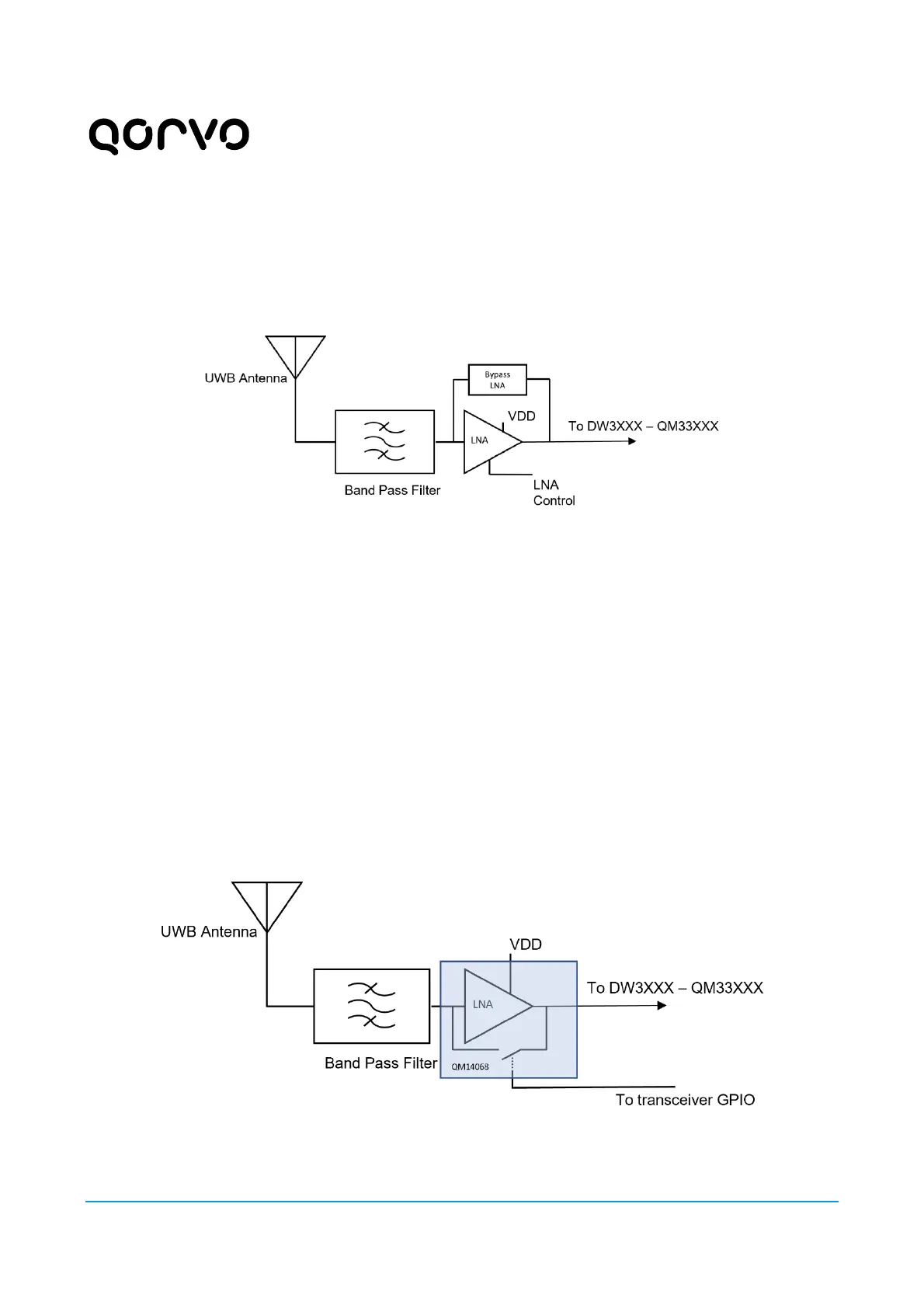 The basic scheme for incorporating an LNA into the QM33100/DW3000 receive/transmit path is illustrated in