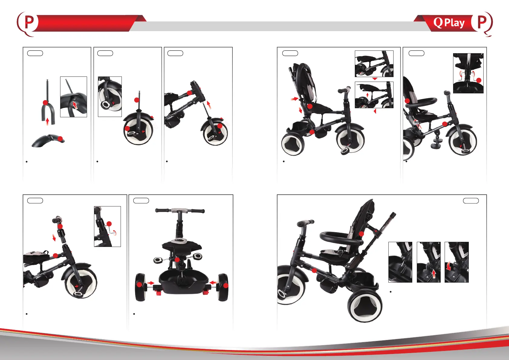 Insert the rear wheels (F) into the trike frame (A)