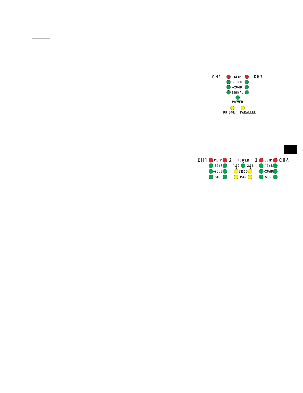 Chaque paire de canaux a un voyant JAUNE pour le mode Pont et un voyant ORANGE pour le