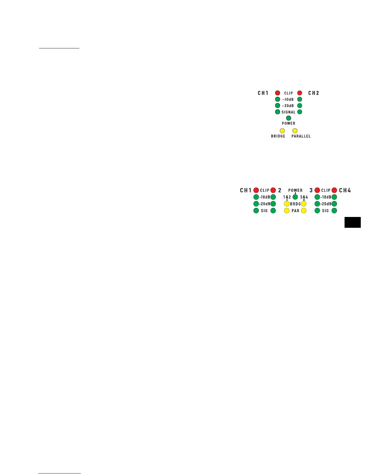 桥接模式下,每个通道对都有一个黄色 LED,并行模式下则为橙色
