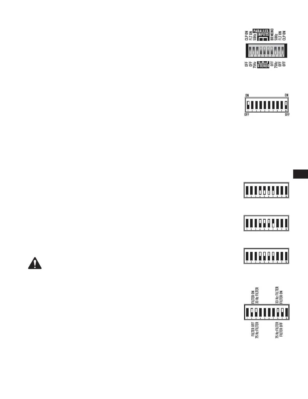 • Les commutateurs 2 et 9 sélectionnent 33/75 Hz (faible impédance) ou 50/75 Hz (modèles V) ou 75 Hz.