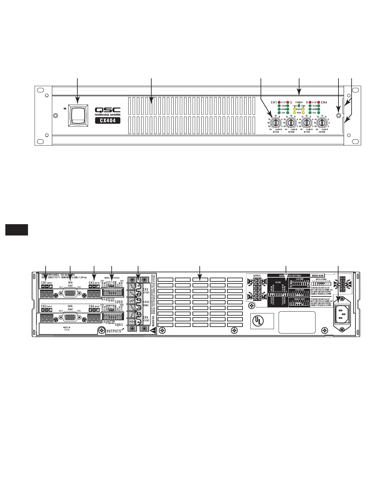 (CX404 in Abbildung 2 abgebildet; andere Modelle sind ähnlich; auch 2-Kanal-Modelle sind mit XLR-Eingängen ausgestattet)