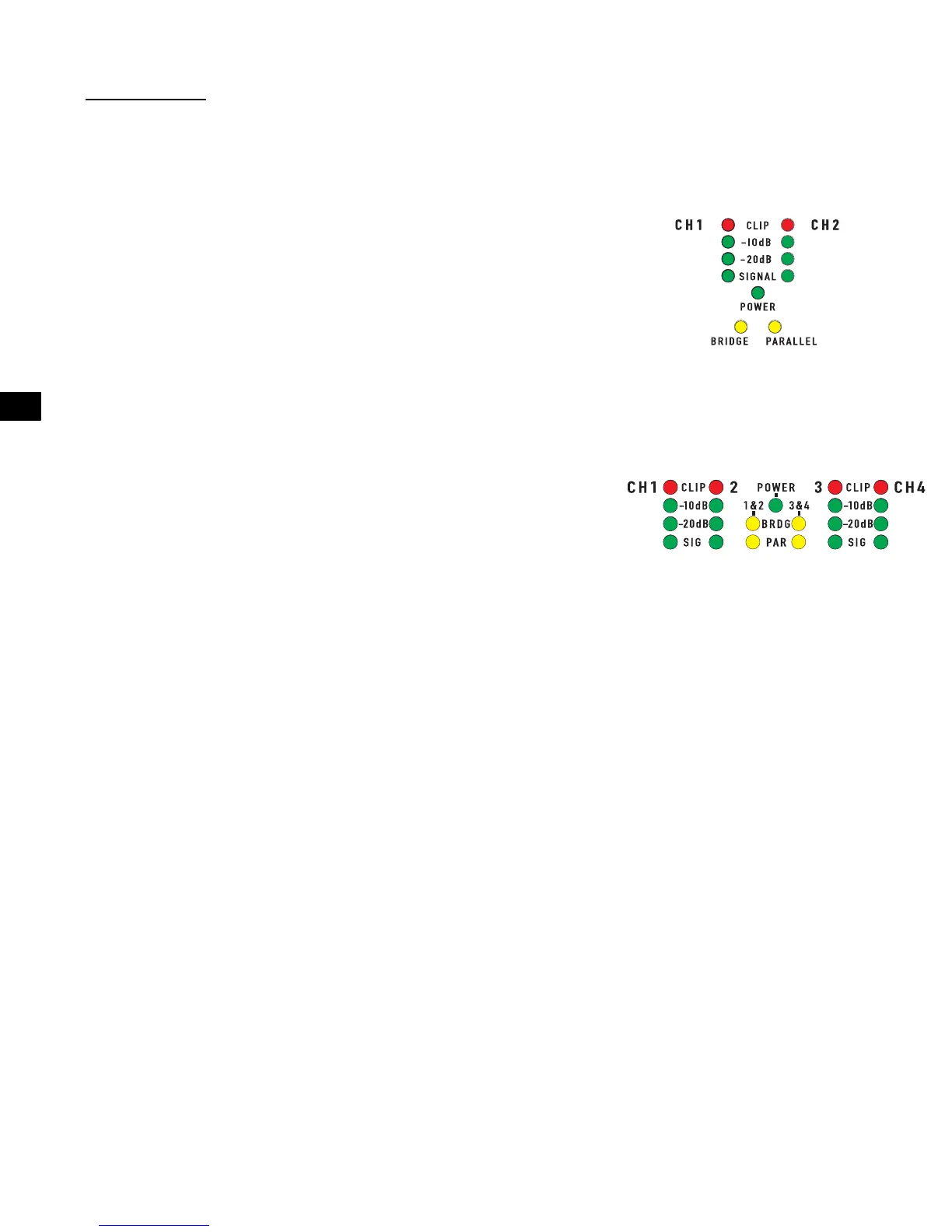Cada par de canales tiene un LED AMARILLO para el modo de puenteado y un LED