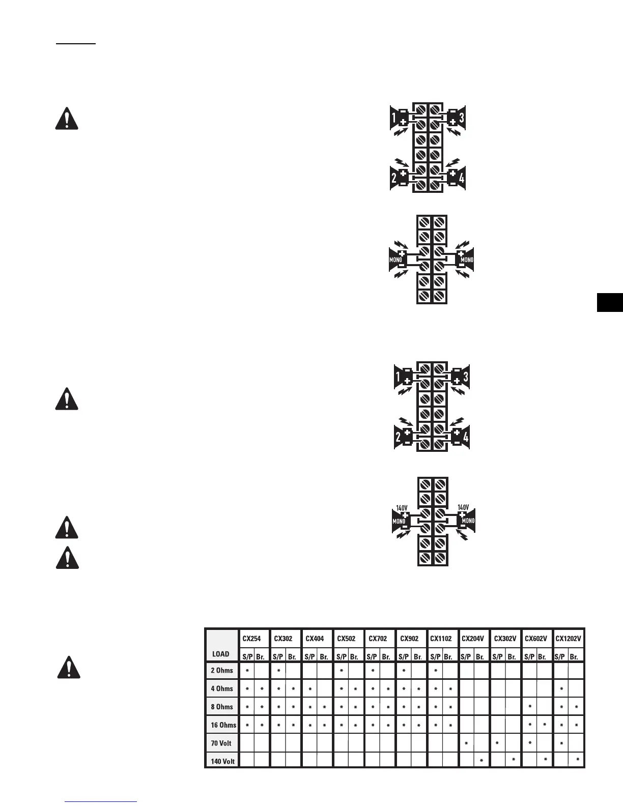 utiliser de charges 70 V en mode Pont ! Utiliser les canaux de mode Stéréo ou