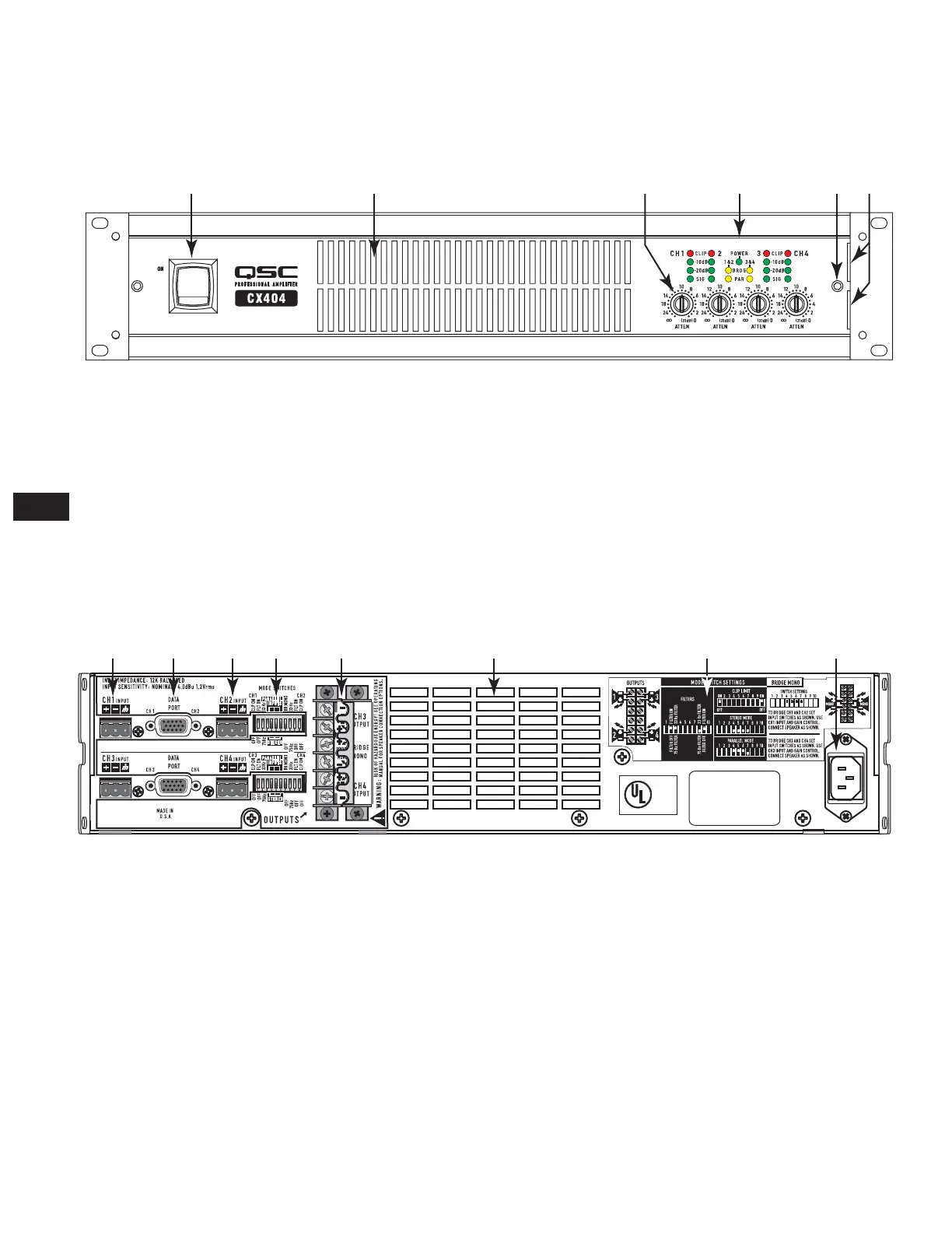 (Se muestra el modelo CX404 en la Figura 2; otros modelos son similares; los modelos de 2 canales también están equipados con entradas XLR)