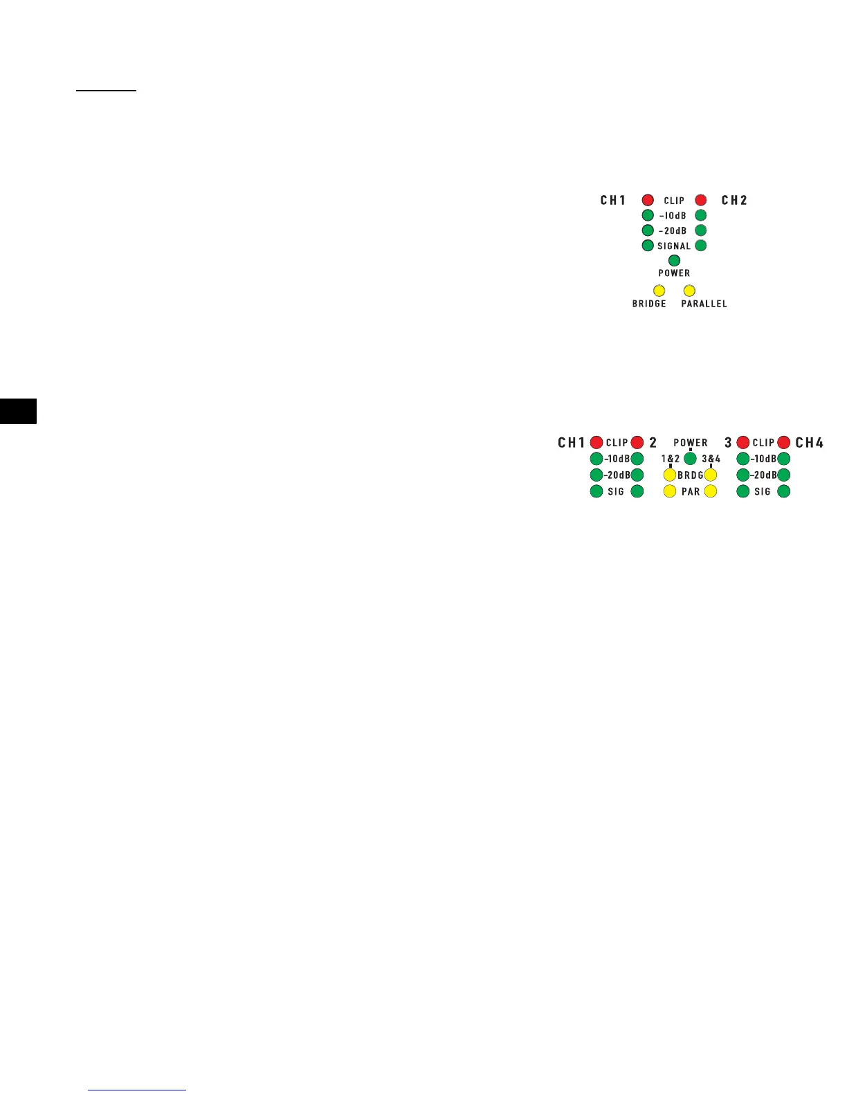 Chaque paire de canaux a un voyant JAUNE pour le mode Pont et un voyant ORANGE pour le