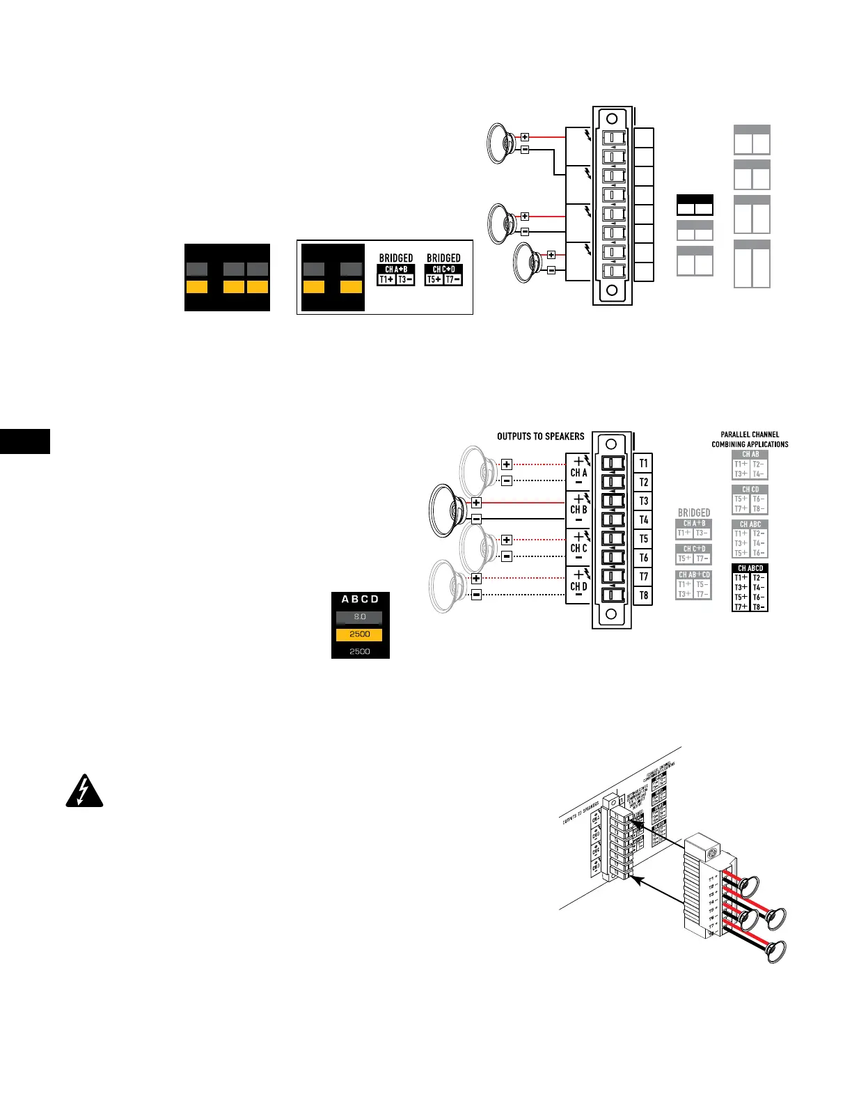 para el amplificador. (Figuras 6 a 8) ) Al combinar canales, QSC recomienda que conecte puentes entre los