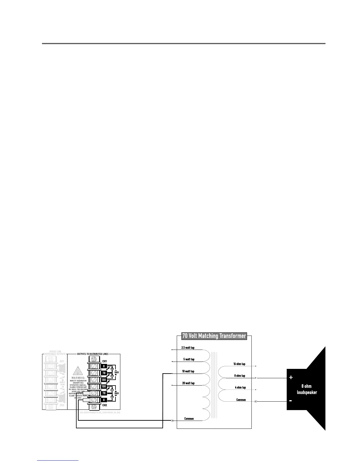 In the illustration below, the 70 volt transformer is connected to the 70 volt output terminals of channel 2 of the amplifier. The input to