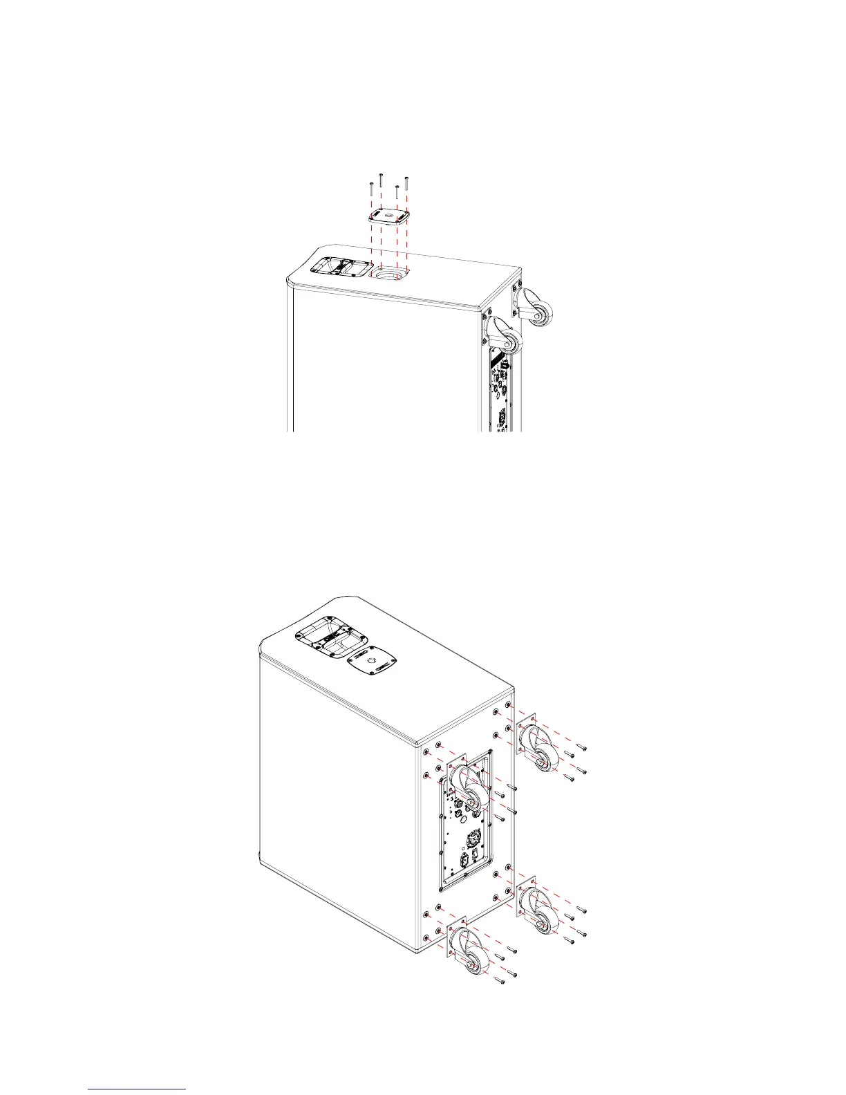 • Remove the four machine screws that secure the caster to the cabinet.