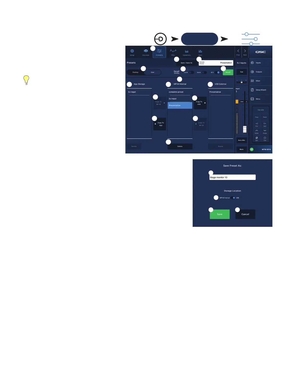 copied to either the App Storage or USB External. In addition, the Preset can be recalled, then be saved or saved as a different preset.