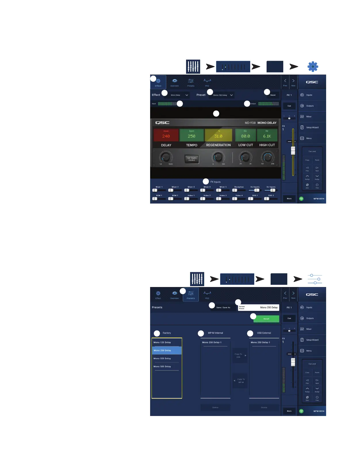 sliders – These control the amount of Input Channel signal going through the Effect. When the slider is at the left side, none of that