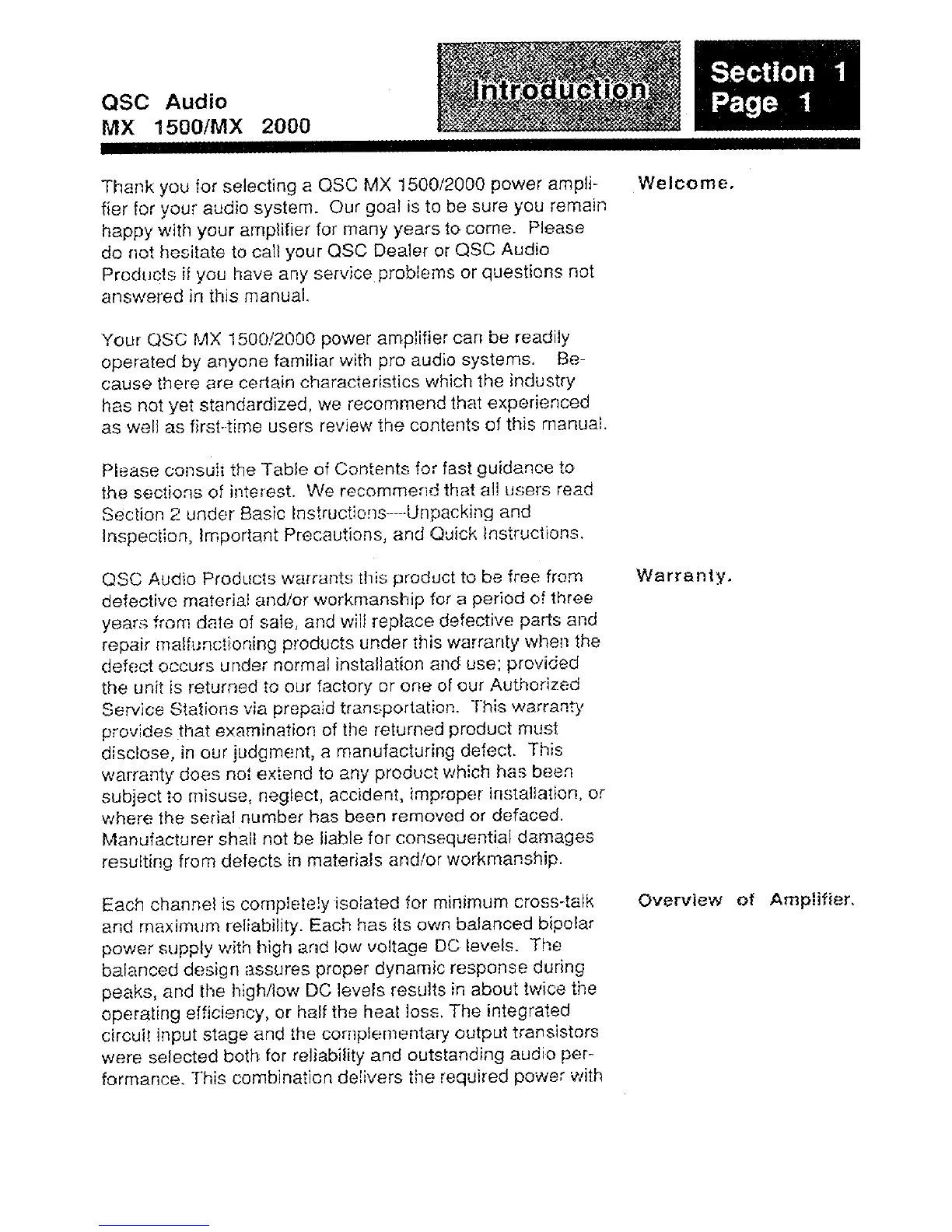 QSC MX 1500 - Introduction; Welcome; Warranty; Overview of Amplifier