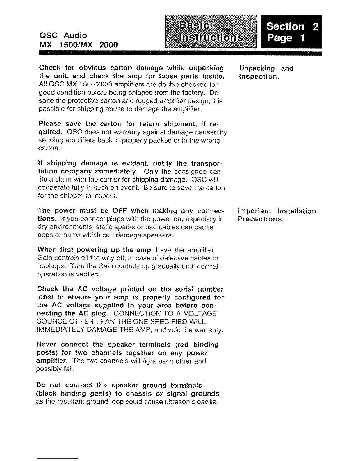 QSC MX 1500 - Basic Instructions; Unpacking and Inspection; Important Installation Precautions