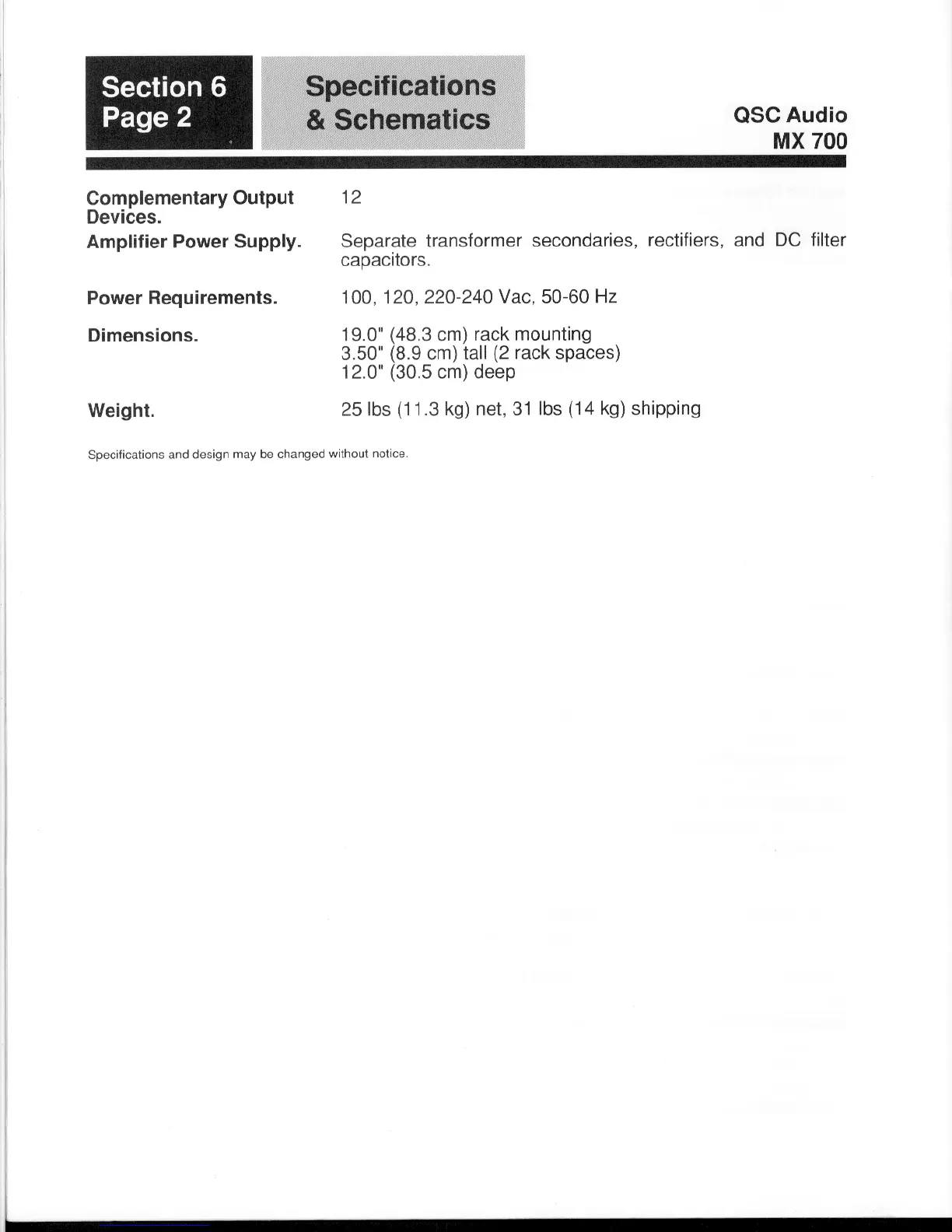 QSC MX 700 - Specifications; Complementary Output Devices; Amplifier Power Supply; Power Requirements