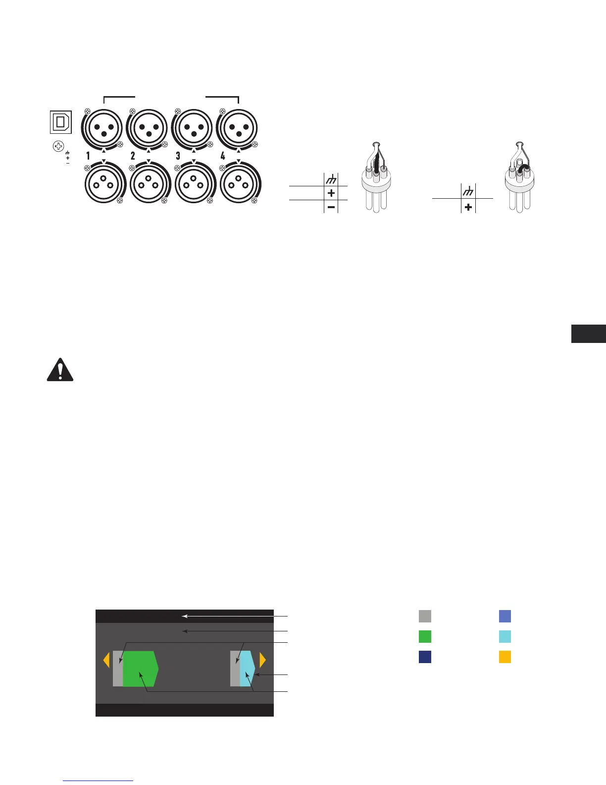 Quatre connecteurs XLR femelles libellés 1 à 4 fournissent les entrées audio aux amplificateurs PLD. Une entrée peut être branchée sur une ou