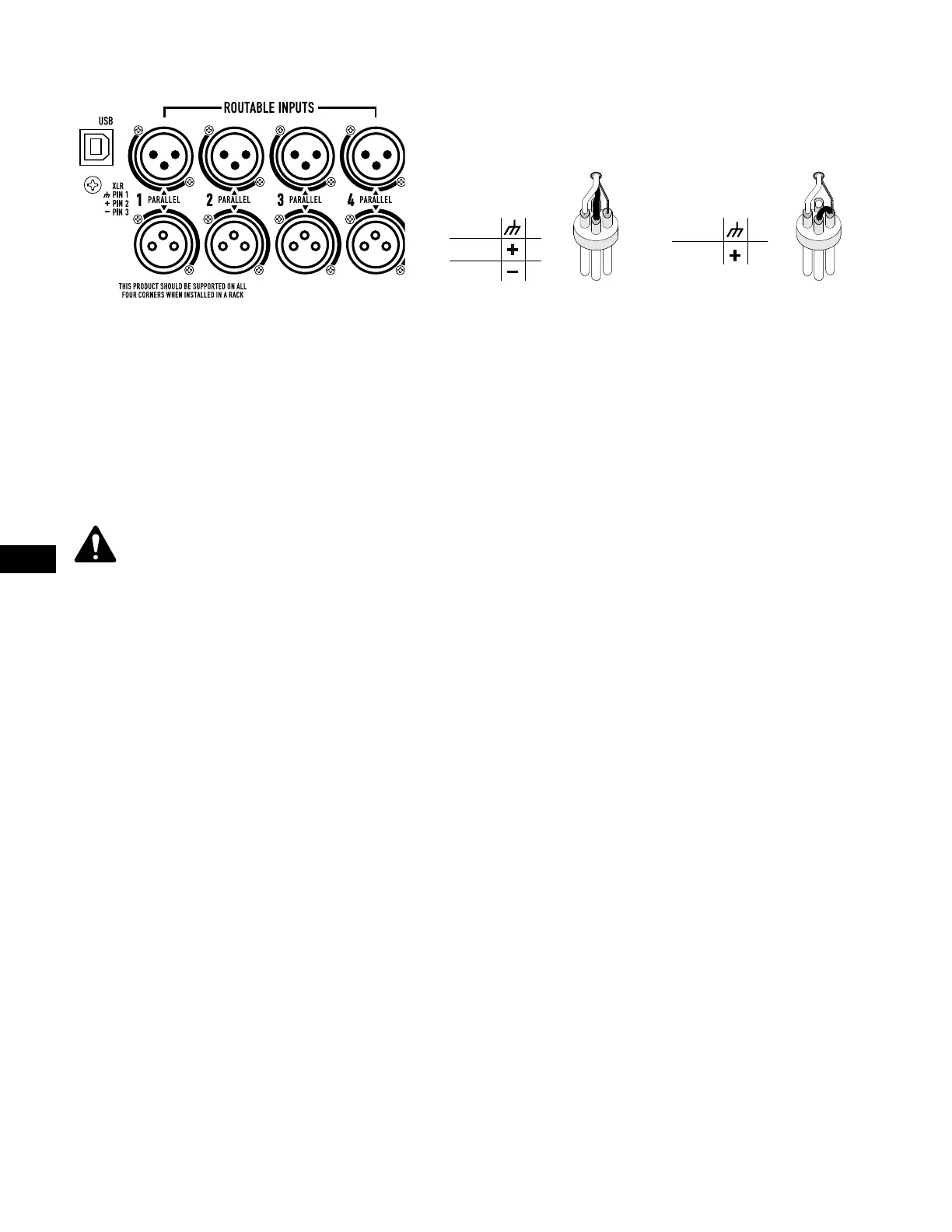 symmetrische oder asymmetrische 10-kΩ-Eingänge, deren Empfindlichkeit auf +4 oder +14 dBu eingestellt werden kann. Vier XLR-Anschlussstecker