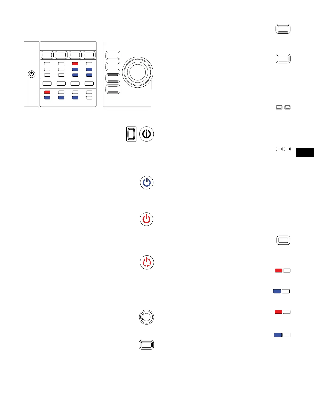 • The SEL buttons illuminate in blue for output channels, and amber for