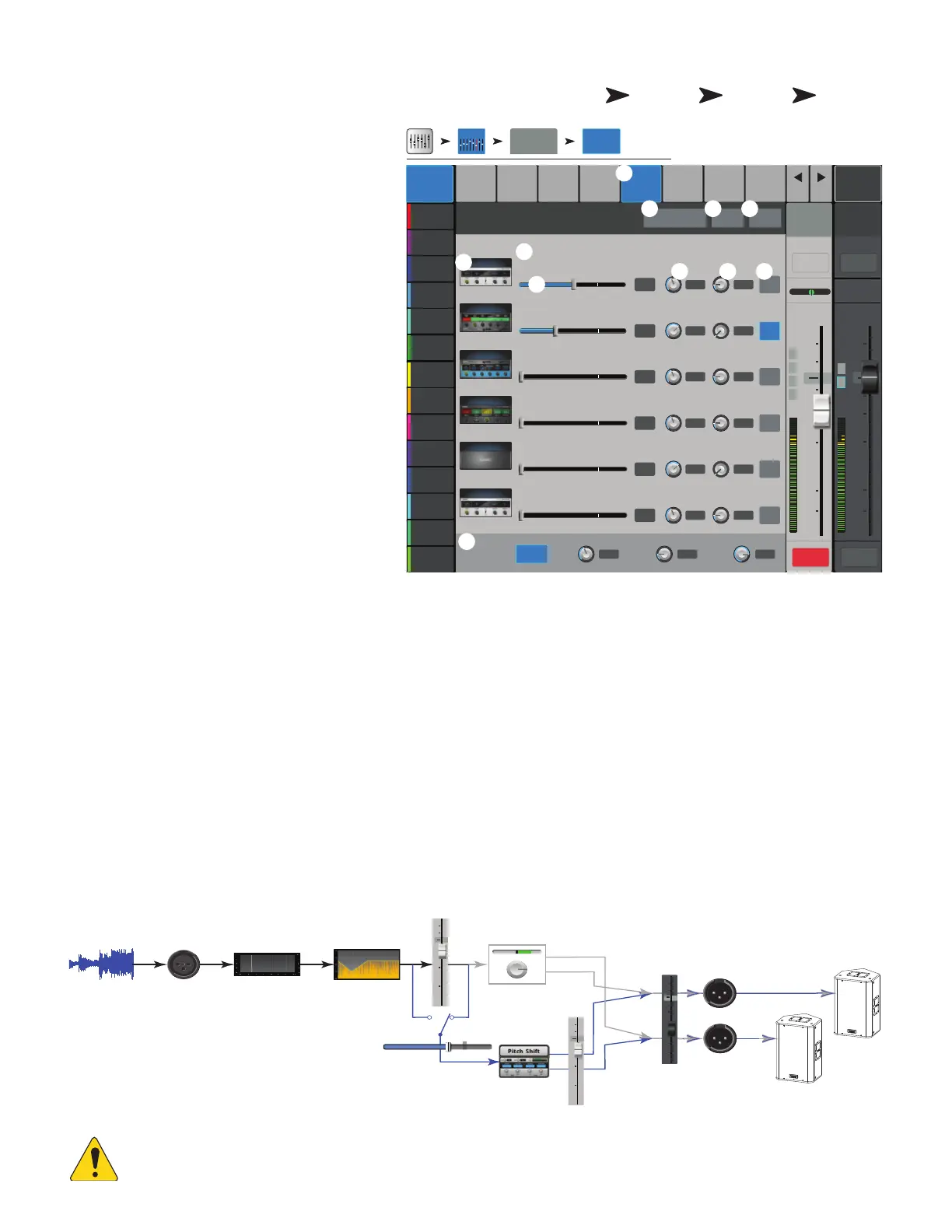 “Dry” audio (no FX processing) continues through the Pan control to the Main L/R Fader and Main outputs.