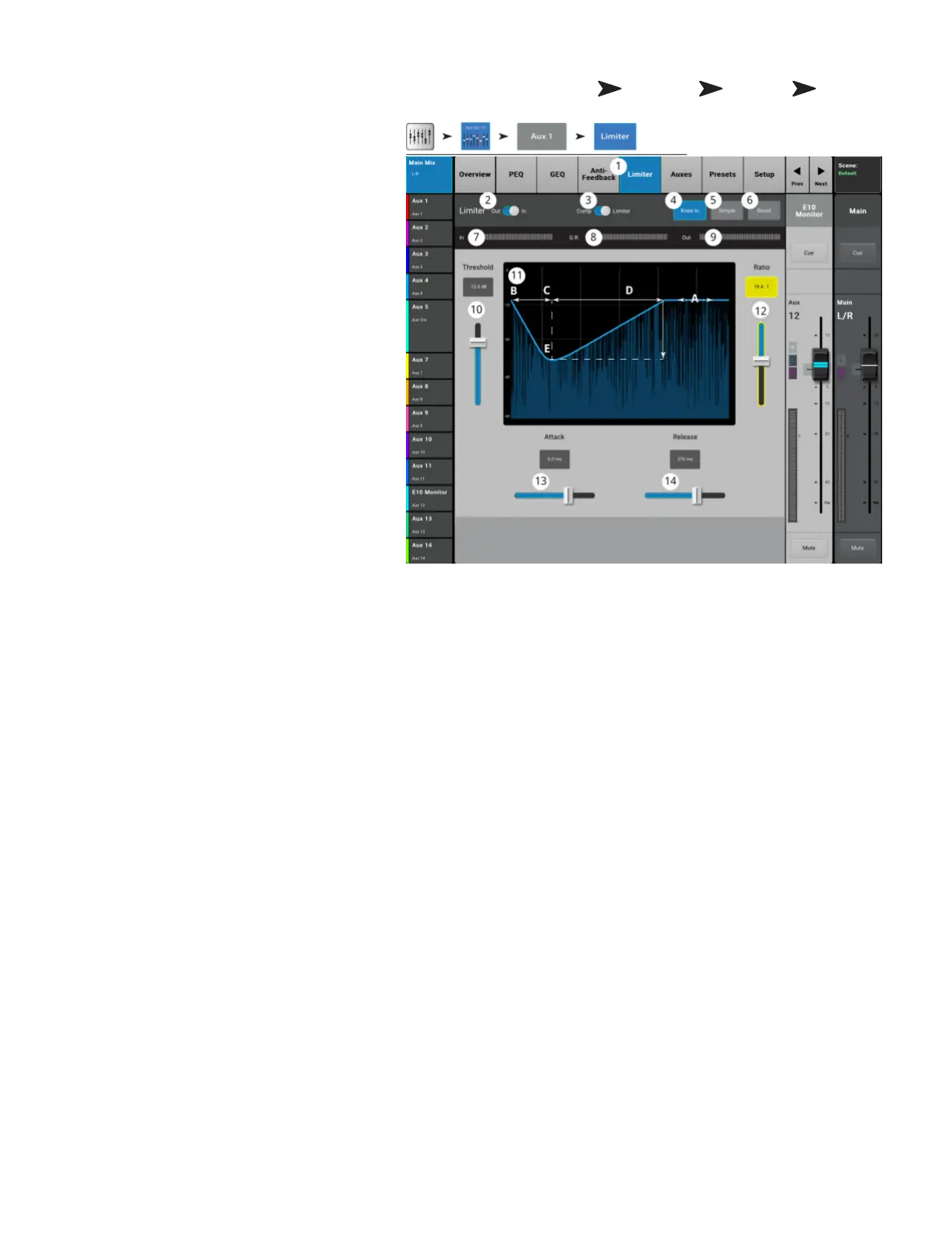 (B to C) – The time it takes for the limiter to reach maximum limiting after the input exceeds the threshold level.