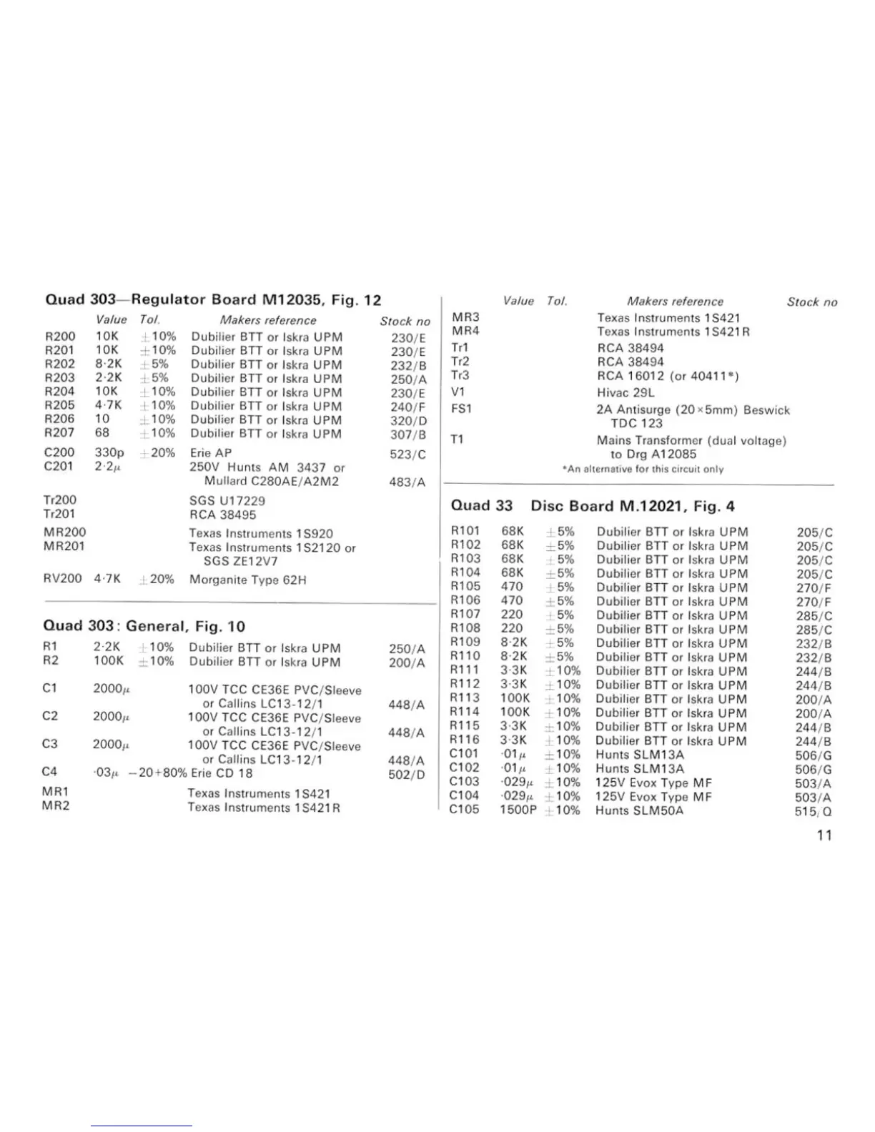QUAD 303 - Component Lists: Regulator and Disc Boards; Quad 303 Regulator Board Components; Quad 33 Disc Board Components; Quad 303 General Components