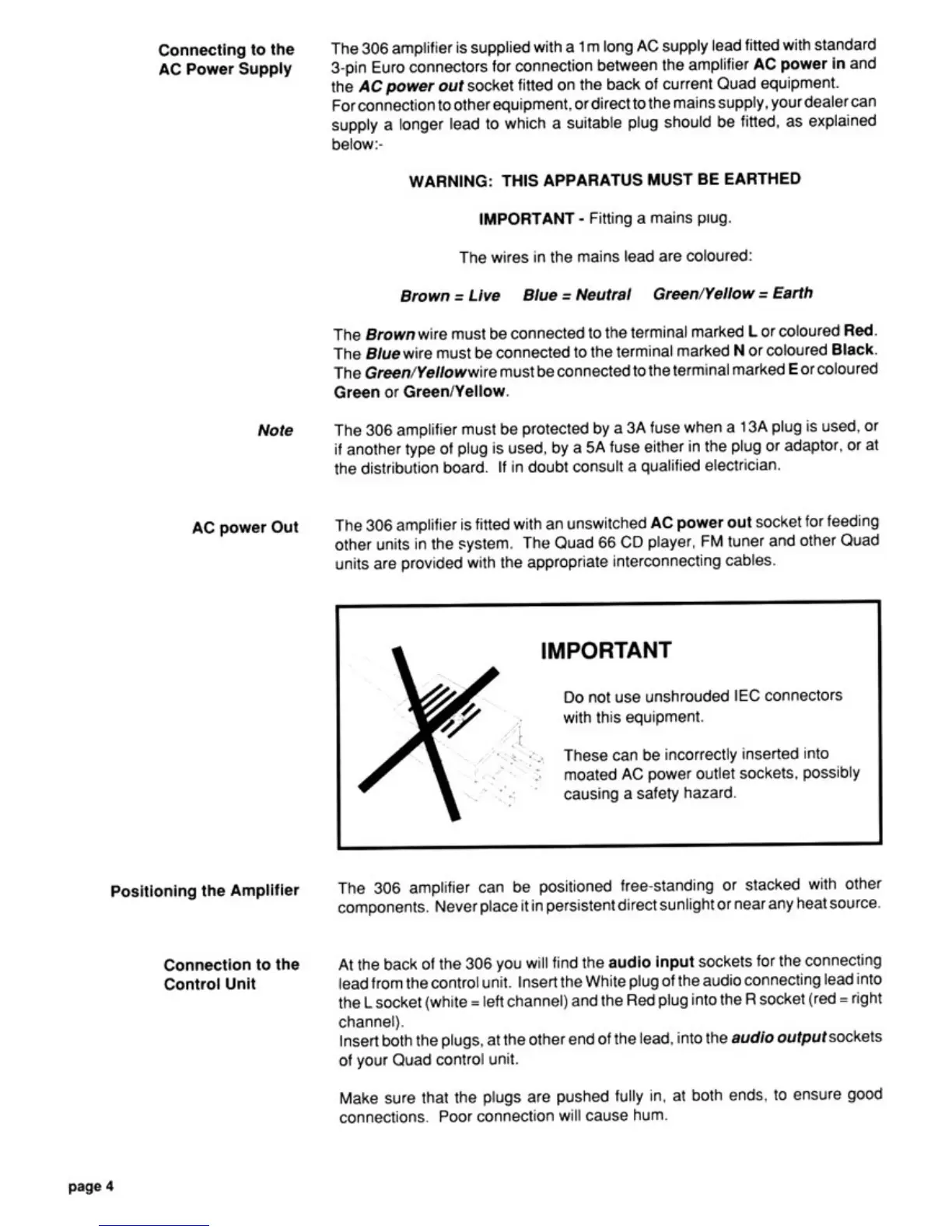 QUAD 306 - Connecting to AC Power Supply; AC Power Output Socket; Amplifier Positioning; Connection to Control Unit
