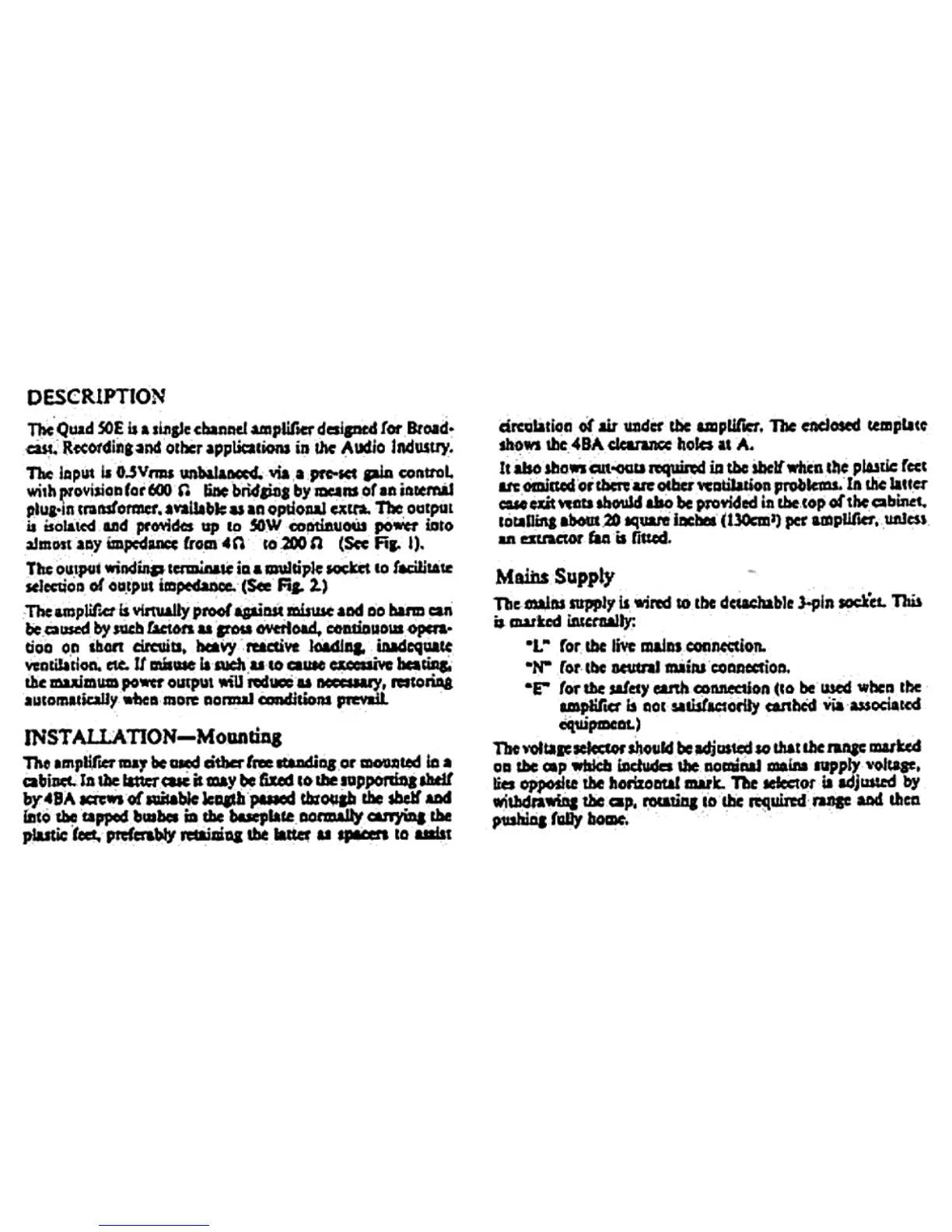 QUAD 50E - Description; Installation and Mounting; Mains Supply