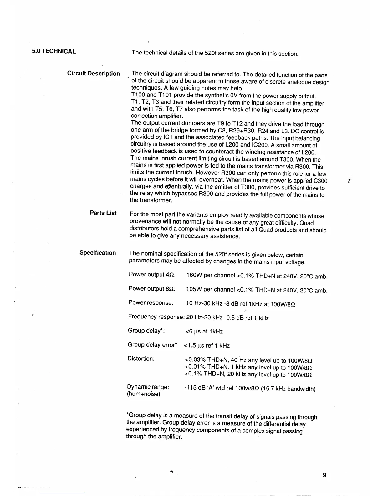 QUAD 520f - 5.0 TECHNICAL SPECIFICATIONS; Circuit Description and Parts List Information; Nominal Technical Specifications