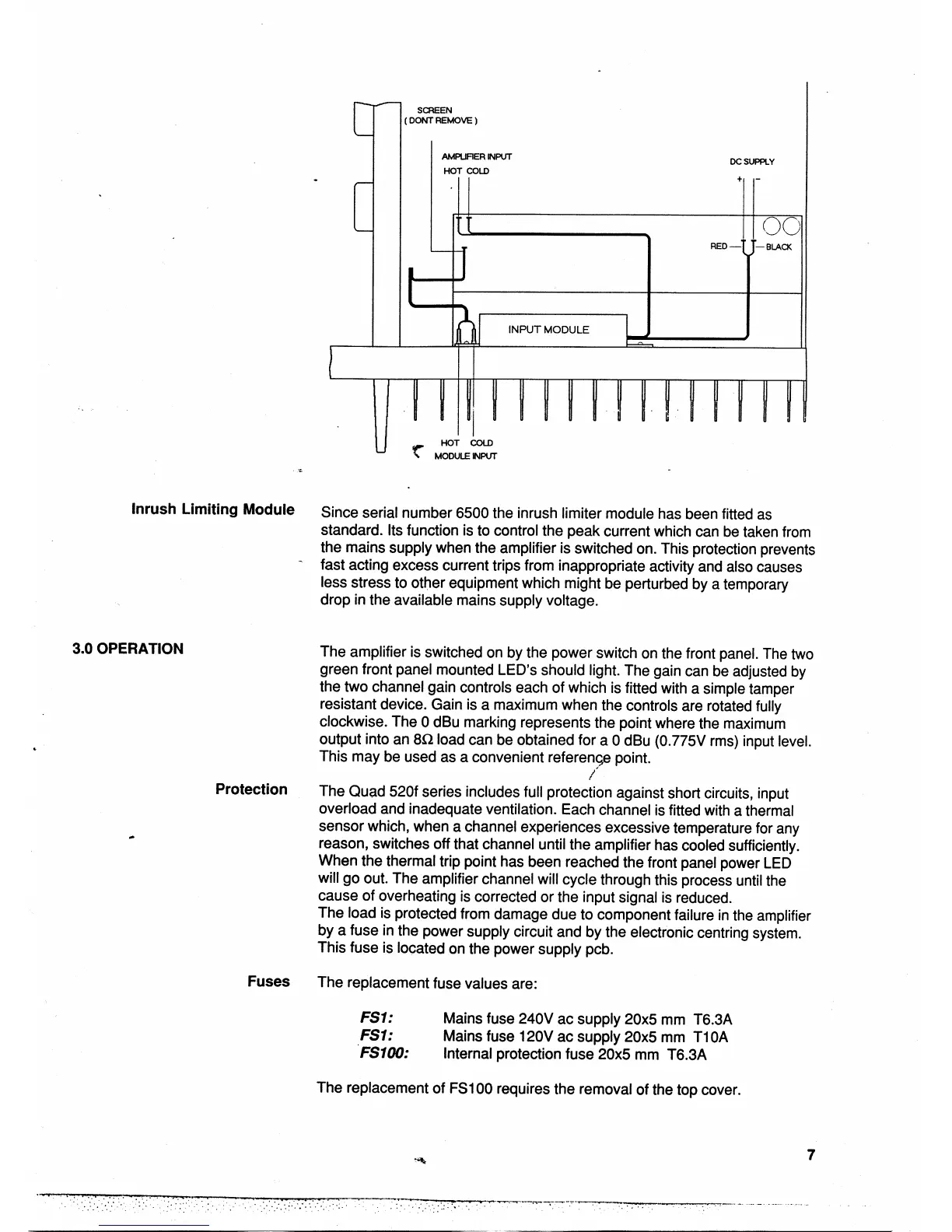 QUAD 520f - 3.0 OPERATION; Inrush Limiting and Protection Features; Fuse Specifications for Replacement