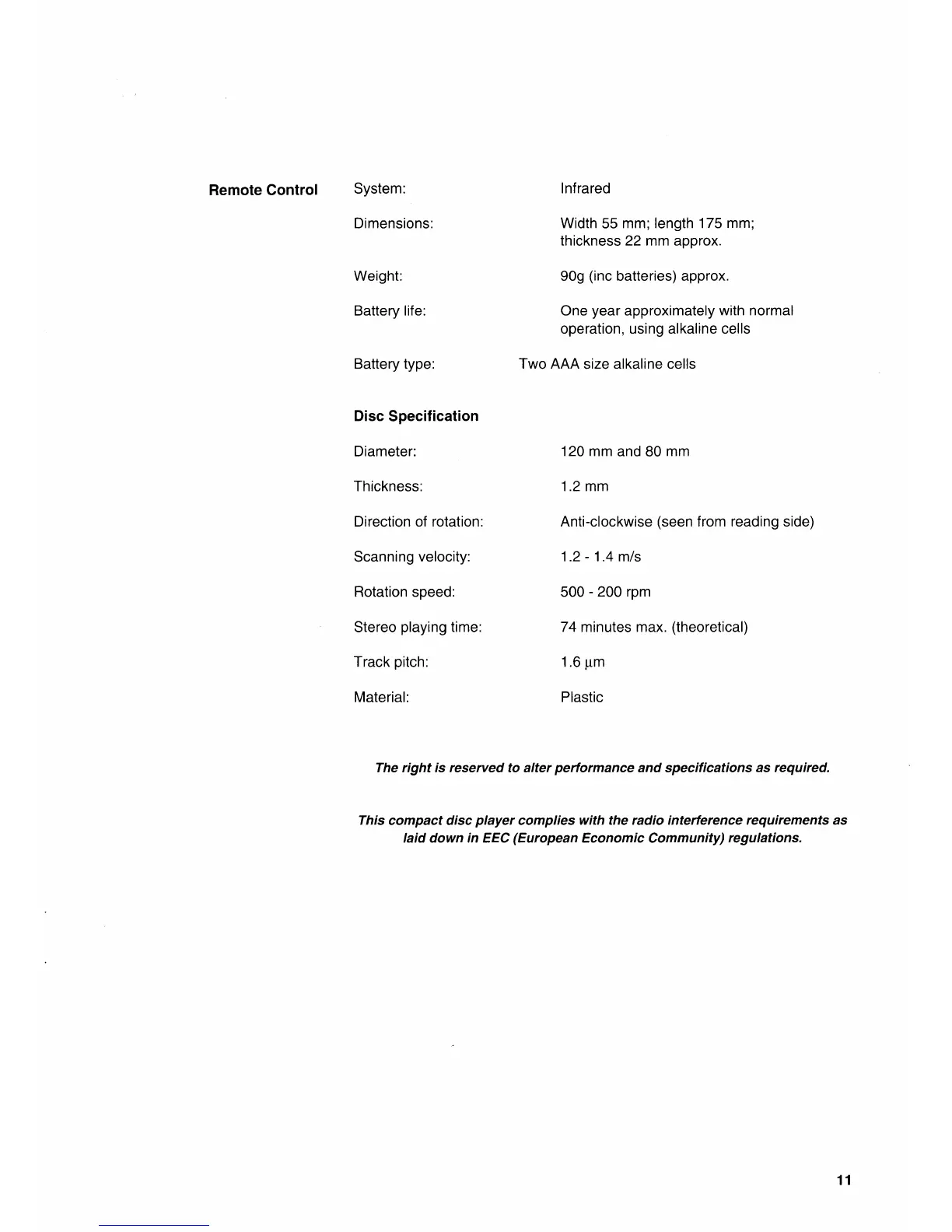 QUAD 67 - Remote and Disc Specifications; Remote Control Details; Disc Playback Details