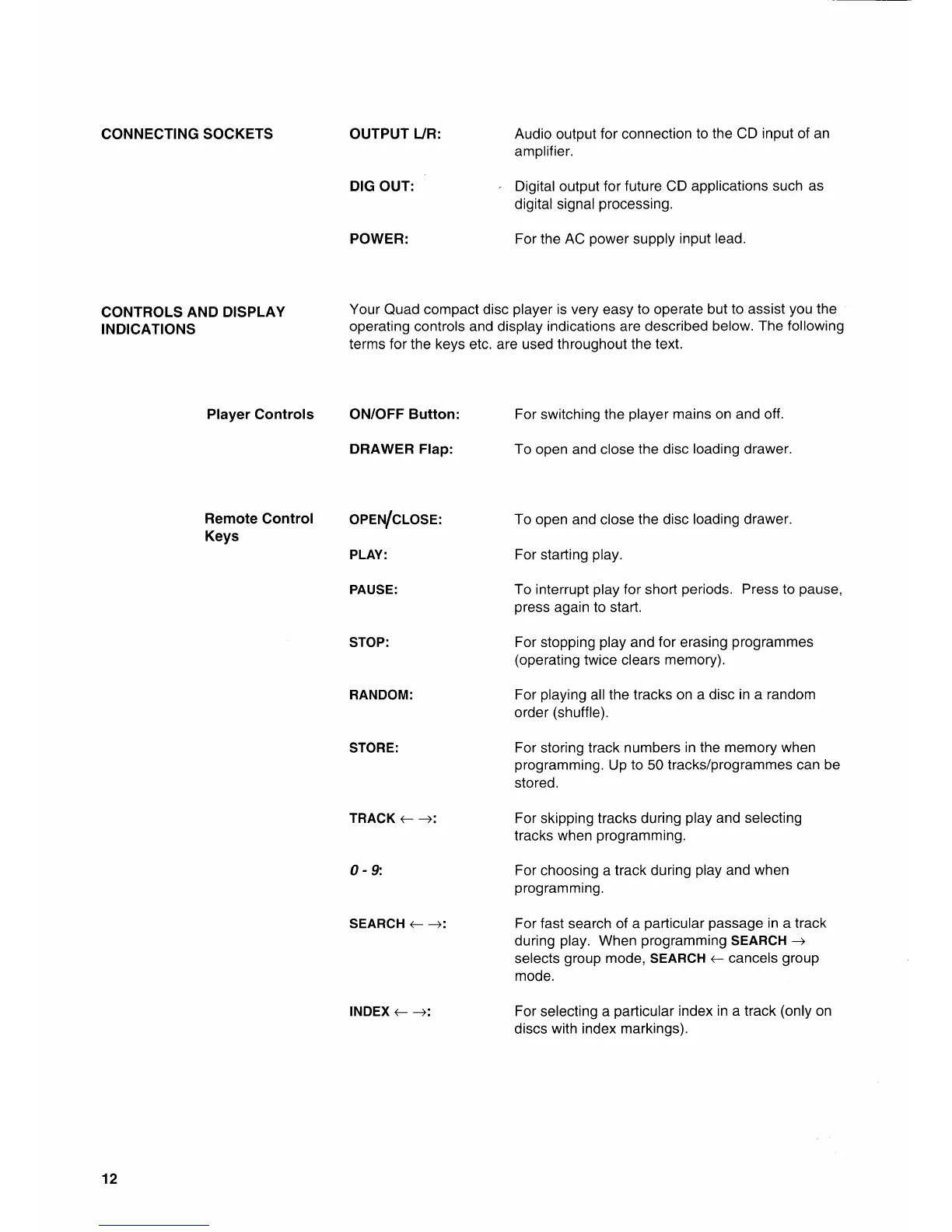 QUAD 67 - Controls and Indicators; Connecting Sockets; Player Controls; Remote Control Keys